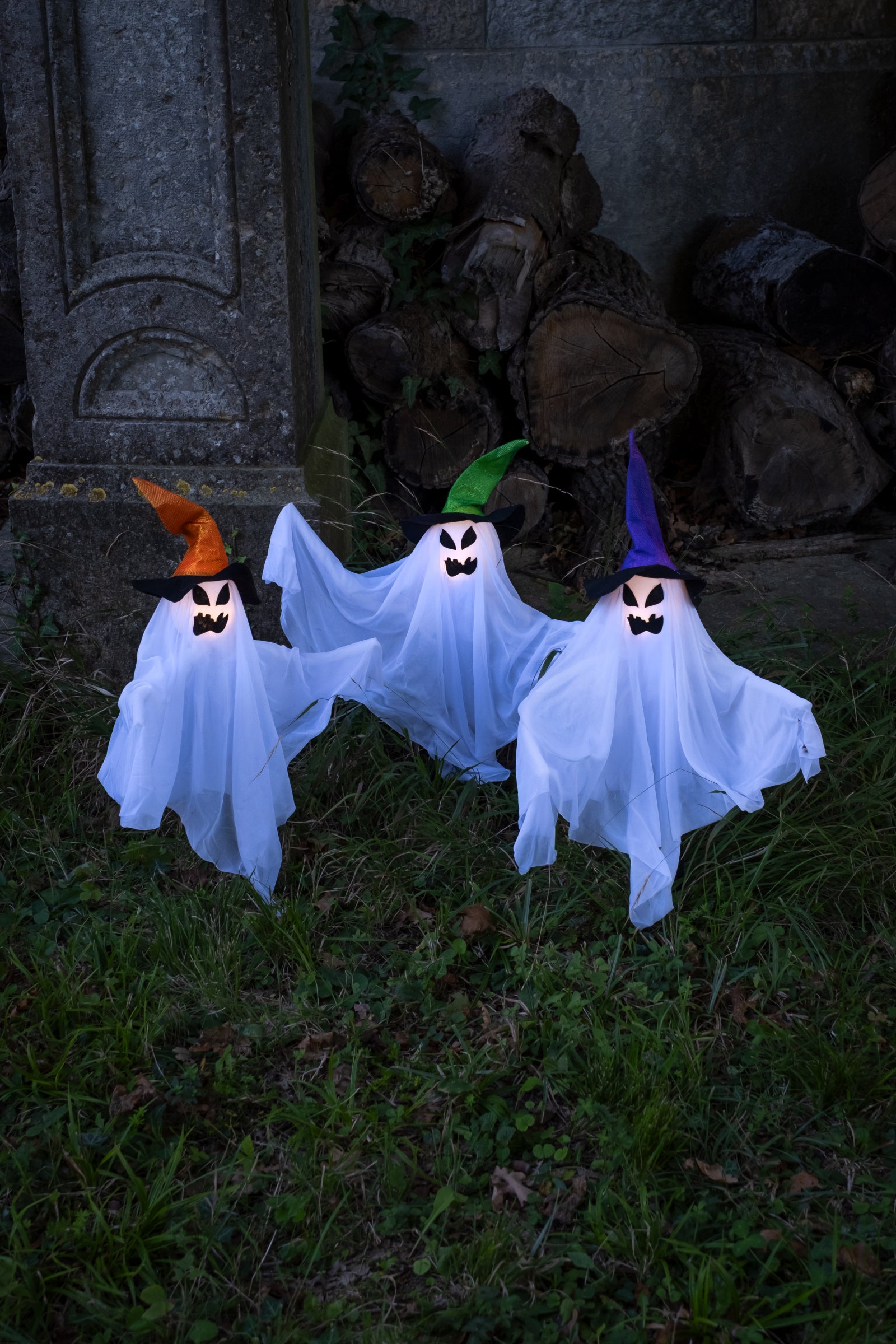 Díky svým vzdušným tvarům jsou tito tři duchové na kůlech skutečným poutačem pozornosti. Každá postavička má na sobě barevný špičatý klobouk a odhaluje osvětlený obličej, což s příchodem noci vytváří magický efekt. Jednoduché stisknutí spínače stačí k tomu, aby se jejich hlavy rozzářily a vytvořily tak perfektní atmosféru pro vaše halloweenské večírky. Umístěte je podél cesty nebo před dveře pro zábavné i strašidelné uvítání. Funguje na 3 AA baterie (nejsou součástí balení). Jednoduchá a efektivní volba pro úspěšnou venkovní dekoraci.