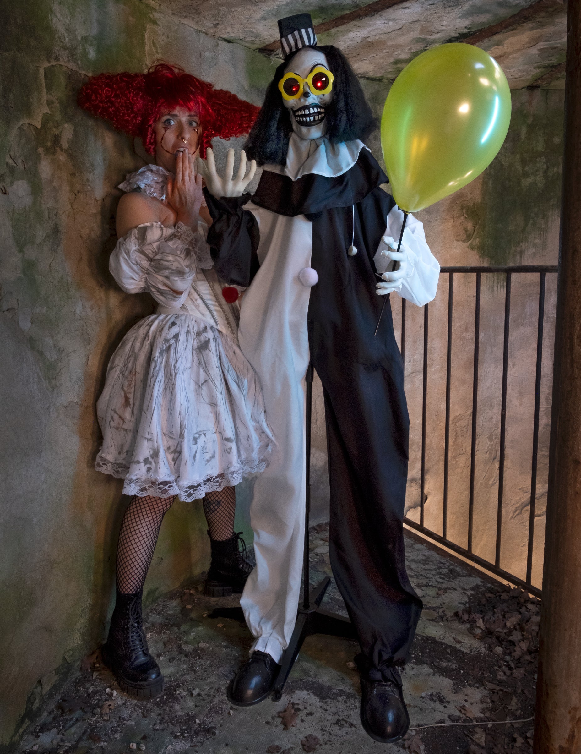 The Animovaný strašidelný klaun se svým černobílým oblečením, jasně žlutýma očima a zmrzlým úsměvem má zlověstný pohled. Jeho strnulá silueta zakončená malým kloboukem kontrastuje s jeho znepokojivým výrazem.