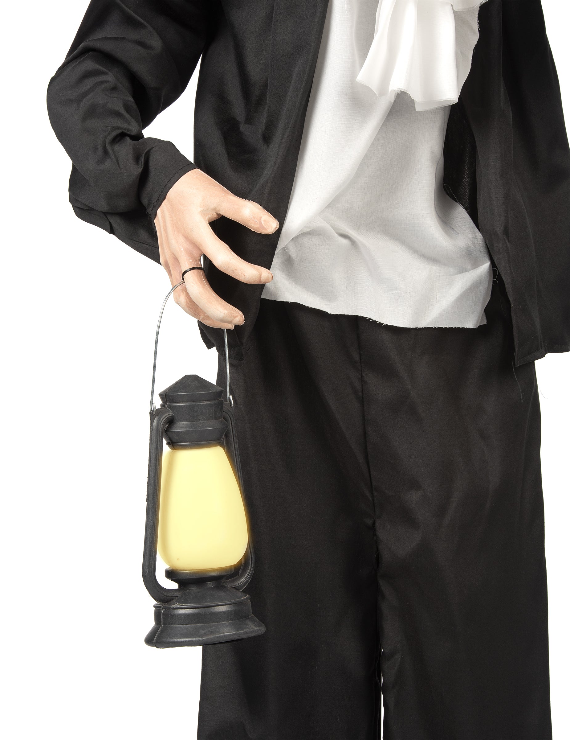 Tento prokletý strážce s lucernou, 158 x 120 cm, Vyvolává znepokojivý pocit, jako by dohlížela na opuštěné místo. Její znepokojivý výraz v obličeji, unavené rysy a shrbený postoj okamžitě vzbuzují nedůvěru. Oblečená v tmavém oblečení, které kontrastuje s nařasenou košilí, mává ponurou lucernou připravenou k rozsvícení. Když se uslyší zvuk, vydá se zlověstný výkřik, jako by se probudila kletba. Baterie, které jsou součástí figurky a její lampy, jsou ideální pro aktivaci této makabrózní přítomnosti, perfektní pro pohlcující a děsivou podívanou.