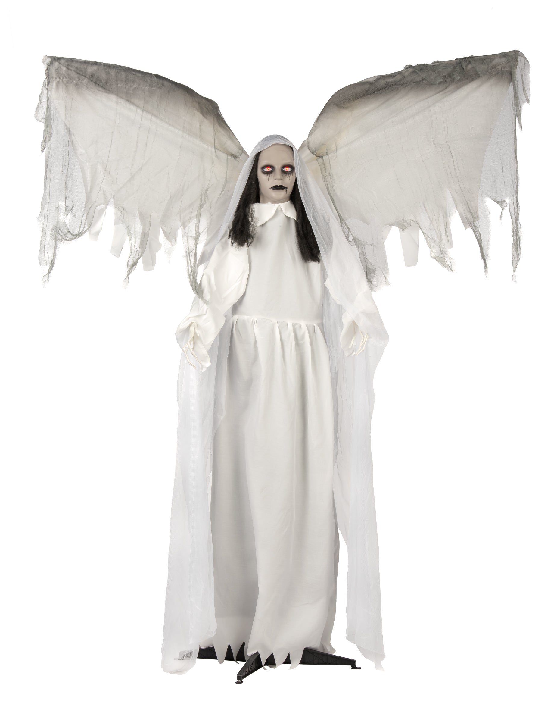 S černými a opotřebovanými křídly, dlouhými, mlhavě bílými šaty a přízračnou tváří, tento animovaný Padlý anděl o rozměrech 120 x 170 cm Vnucuje svou přítomnost. Zdá se, jako by se vznášela mezi dvěma světy, připravená vynořit se z nicoty. Při sebemenším zvukovém rušení roztáhne křídla, rozzáří oči a ozve se mrazivé vytí. Její spínač umožňuje její předběžnou aktivaci a vytvoření efektu ve správný okamžik. Dekorace funguje na 4 AA baterie (nejsou součástí balení). Umístěte ji do vstupní haly, nad schodiště nebo do slabě osvětlené místnosti pro zaručený dramatický efekt.