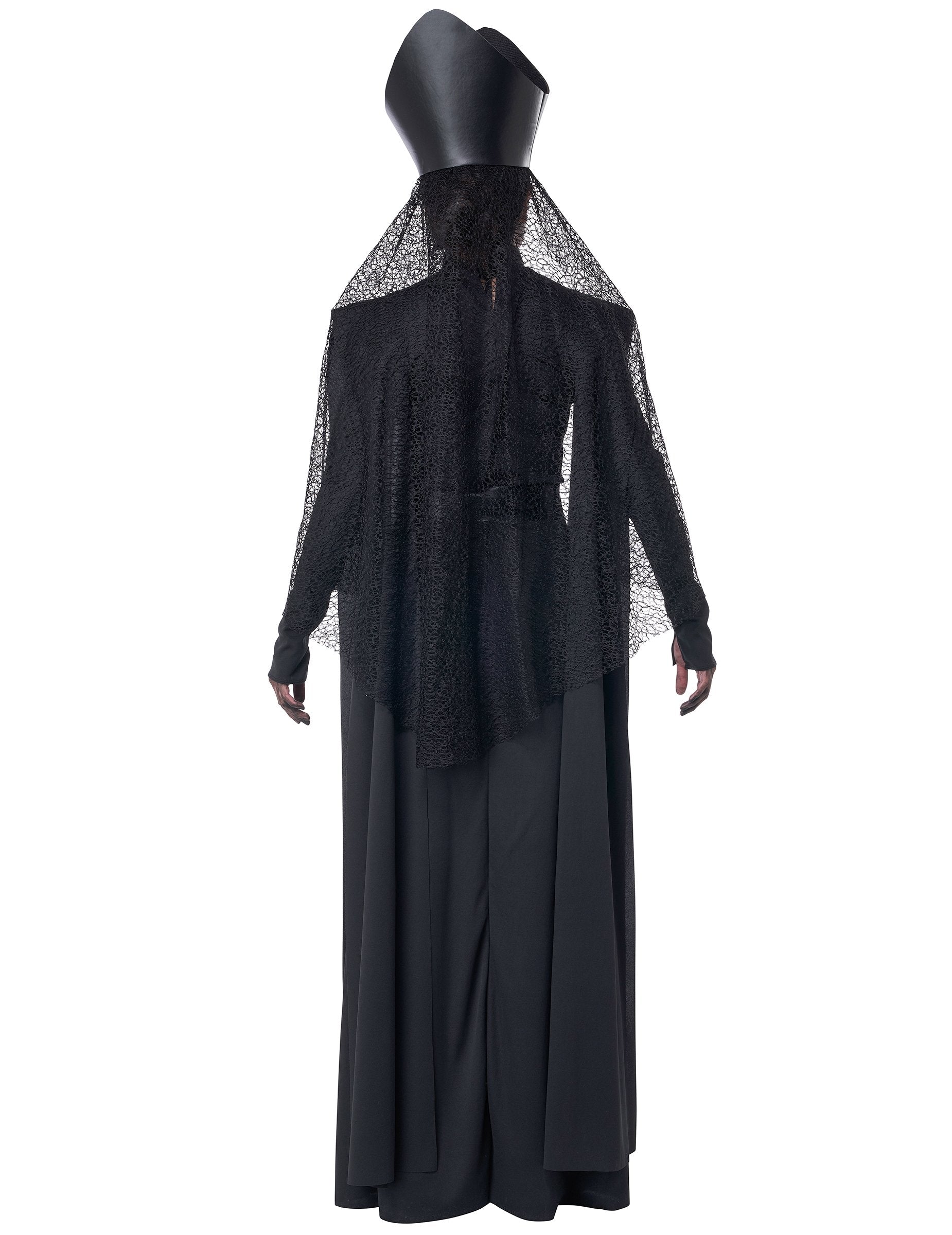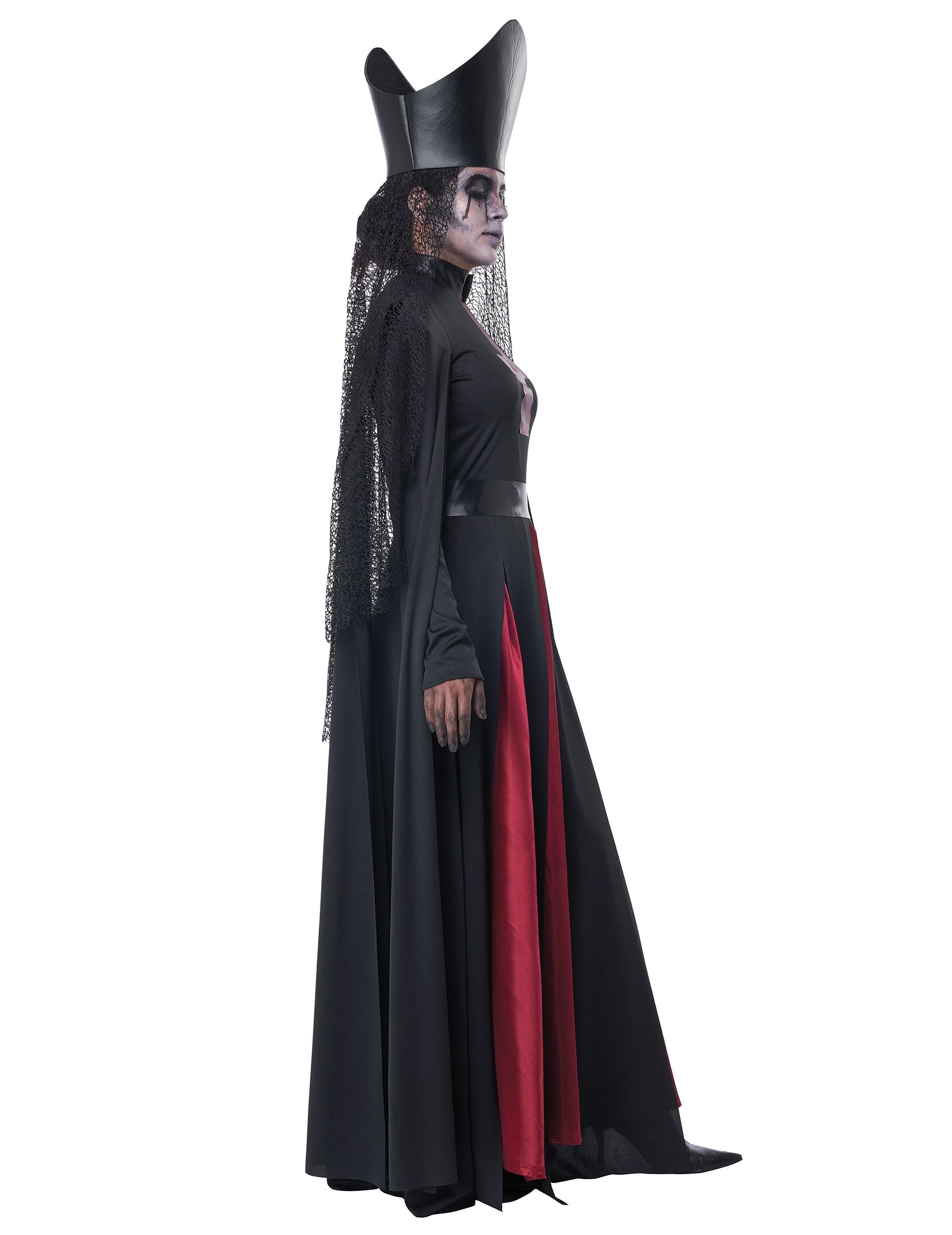 Tento mystický a znepokojivý kostým vás promění v kněžku temnoty připravenou vykonat své nejzáhadnější rituály. Součástí kostýmu jsou dlouhé černé šaty zdobené impozantním červeným křížem na trupu s rozparky odhalujícími sytě červenou látku, která posiluje její temnou auru. Šaty jsou přehozeny přes tmavě červenou sukni, která je nastavitelná díky gumičce a poskytuje pohodlí a eleganci. Černý plášť s okultními motivy halí siluetu sofistikovaně, zatímco krajkový závoj dodává dramatický a mystický rozměr. Ústředním prvkem kostýmu, impozantní papežská čelenka, sublimovaná ezoterickými symboly, dodává kostýmu podmanivý vzhled. Černý pás harmonicky doplňuje celek. Tento kostým okultní kněžky, ideální pro Halloween, démonickou párty nebo temný cosplay, je ideální pro ztělesnění fascinující i impozantní postavy. Zkombinujte jej s intenzivním make-upem a ezoterickými doplňky pro ještě výraznější a nezapomenutelný efekt!