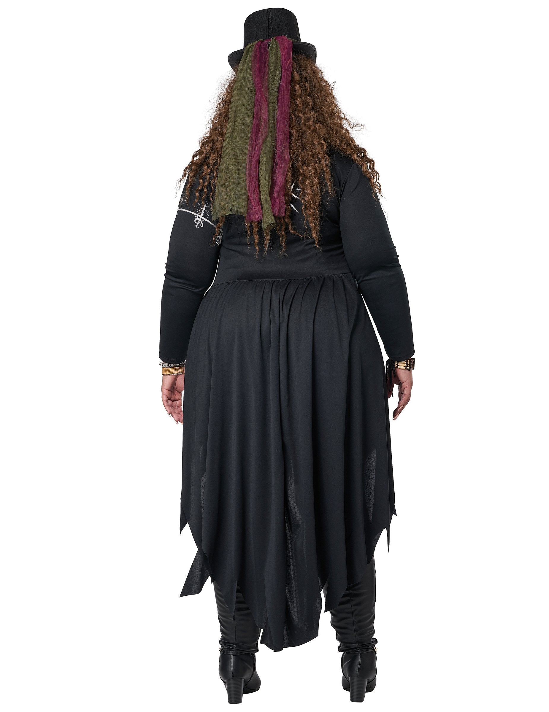 Ponořte se do světa mystiky s tímto temným a okouzlujícím kostýmem voodoo kněžky. Součástí kostýmu je dlouhá, asymetrická černá bunda zdobená roztřepenými detaily pro tajemný a dramatický efekt. Texturovaný červený top, zdobený vzory inspirovanými voodoo rituály, dodává kostýmu autentický nádech, zatímco ozdobný pásek s imitací kostí posiluje mystické kouzlo. Cylindr zdobený okultními detaily tento outfit doplňuje a dodává mu bezkonkurenční vzhled. Náhrdelník ve tvaru opičí ruky, mocný symbol okultních přesvědčení, zdůrazňuje realismus a mystickou auru tohoto outfitu a dodává vašemu vzhledu ezoterický nádech. Tento kostým voodoo čarodějnice je ideální na Halloween, tematickou párty nebo jiný svátek svatého Jakuba a zaručuje vám výrazný a podmanivý vzhled. Přidejte několik doplňků, jako je mystická hůl nebo falešný had, pro ještě pohlcující proměnu!