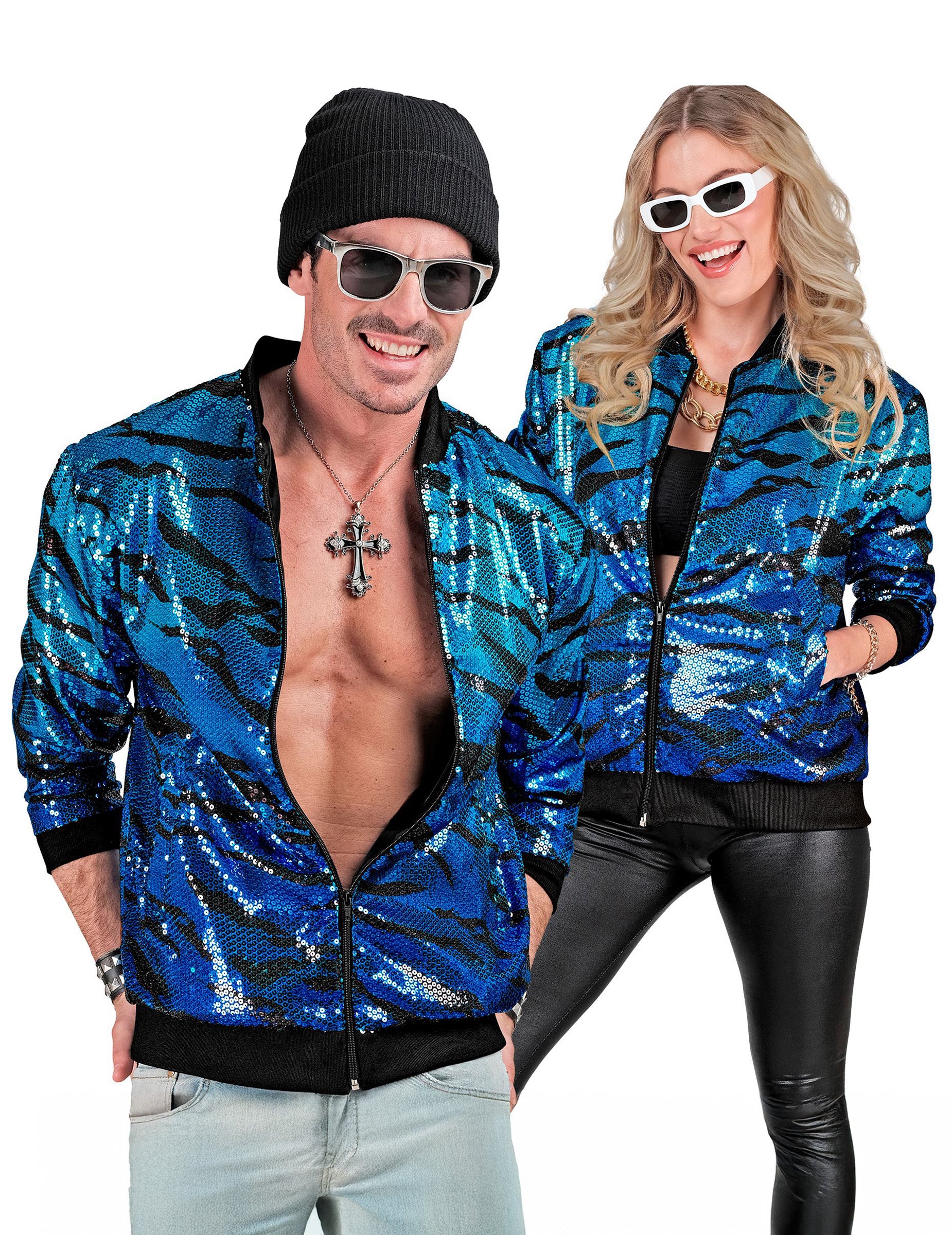 Oslňte jedinečným vzhledem s touto unisex bomber bundou, navrženou z lehké látky pokryté modrými a černými flitry, které zvýrazňují elegantní vlnkovaný vzor. Perfektní kombinace modernosti a třpytu, ideální pro ty, kteří chtějí zazářit při každé příležitosti.