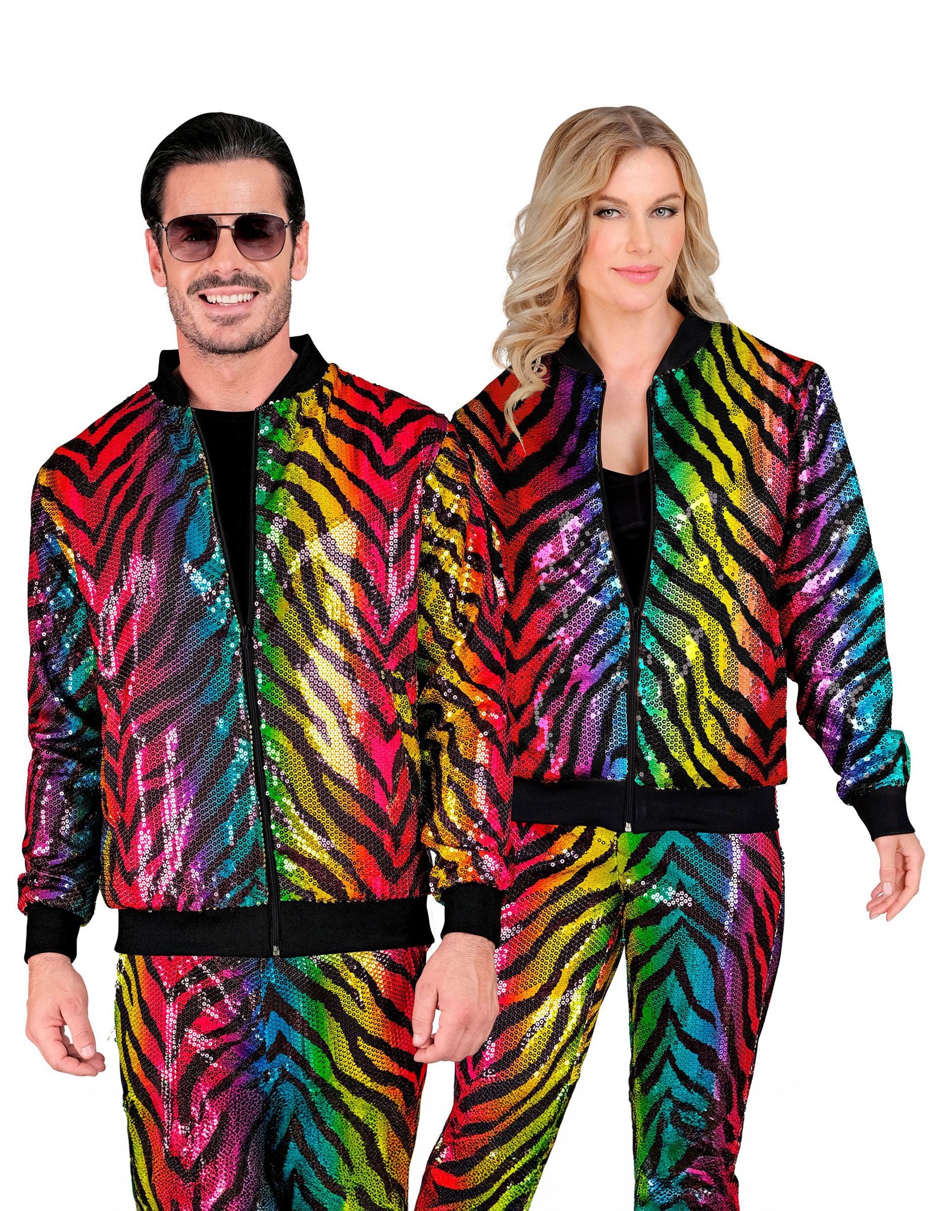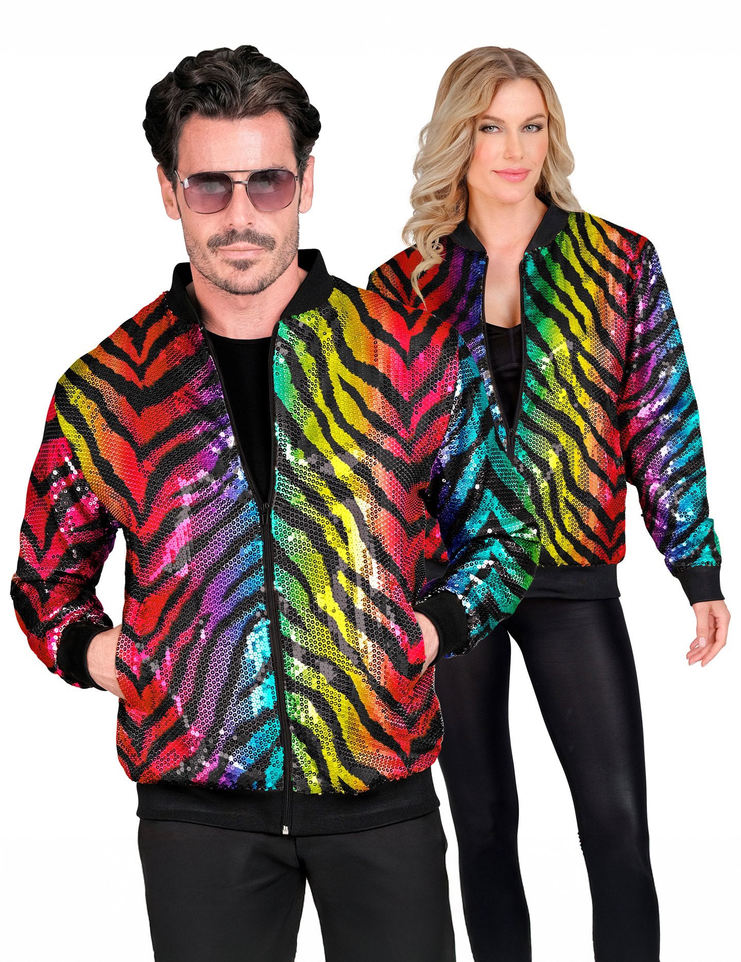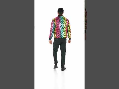 Udělejte si dojem s touto unisex bomber bundou, vyrobenou z lehké látky pokryté vícebarevnými flitry s výrazným tygřím potiskem. Dokonalá směs městského stylu a bujnosti, ideální pro ty, kteří rádi vynikají. Její jedinečný design září duhovými flitry a vytváří výrazný vizuální efekt. Černé žebrované lemy na límci, manžetách a v pase dodávají střihu kontrastní nádech a perfektní střih, zatímco přední zip dodává bundě praktický a moderní rozměr. Tato bunda je ideální na karneval, diskotéku, festival nebo slavnostní událost a zaručuje zářivý a nezapomenutelný dojem, připravená upoutat pozornost všech!
