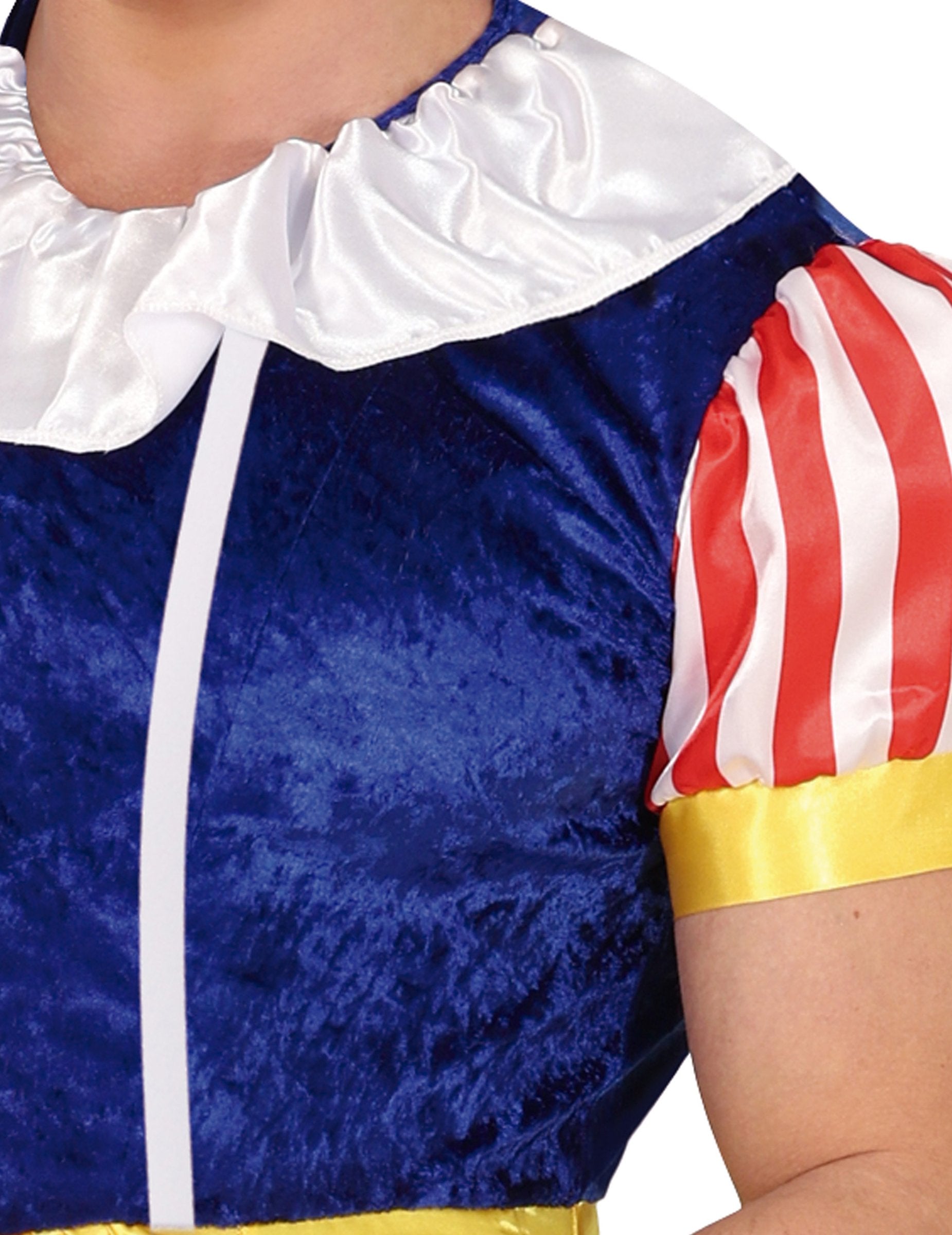 Díky nabíraným pruhovaným rukávům, modrému sametovému živůtku a žluté saténové sukni připomíná tento outfit klasiku v novém pojetí s pořádnou dávkou humoru. Integrovaný pásek ukrývá zábavné překvapení, které zaručeně pobaví.