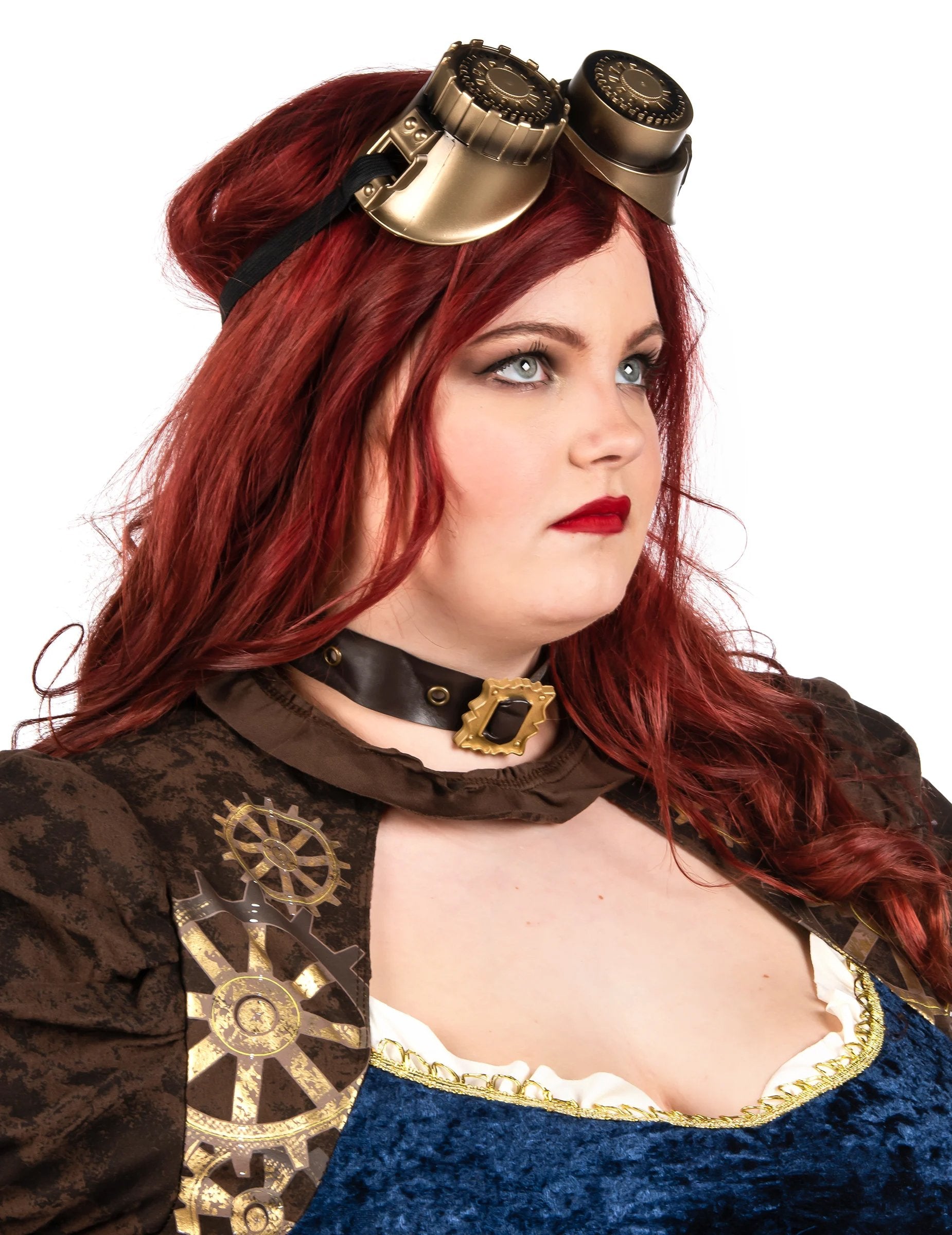 Tento steampunk kostým pro ženy ve větší velikosti se skládá ze šatů, rukavic, návleků na boty, náhrdelníku a pilotních brýlí. Šaty kombinují půlnočně modrý samet, umělou kůži a krémovou krajku, zvýrazněné kříženým šněrovacím korzetem a ozdobnými prvky, které vás ponoří do retro-futuristického vesmíru. Nafouklé rukávy a asymetrická sukně dodávají tomuto outfitu inspirovanému sci-fi romány z 19. století elegantní nádech. Doplňky dokonale doplňují celek: texturované návleky na boty, sladěné rukavice, náhrdelník a steampunk brýle dodávají tomuto stylu mechanický nádech, který je pro tento styl tak charakteristický. Ideální na Halloween, tematickou párty, cosplay country nebo karneval alternativní historie!