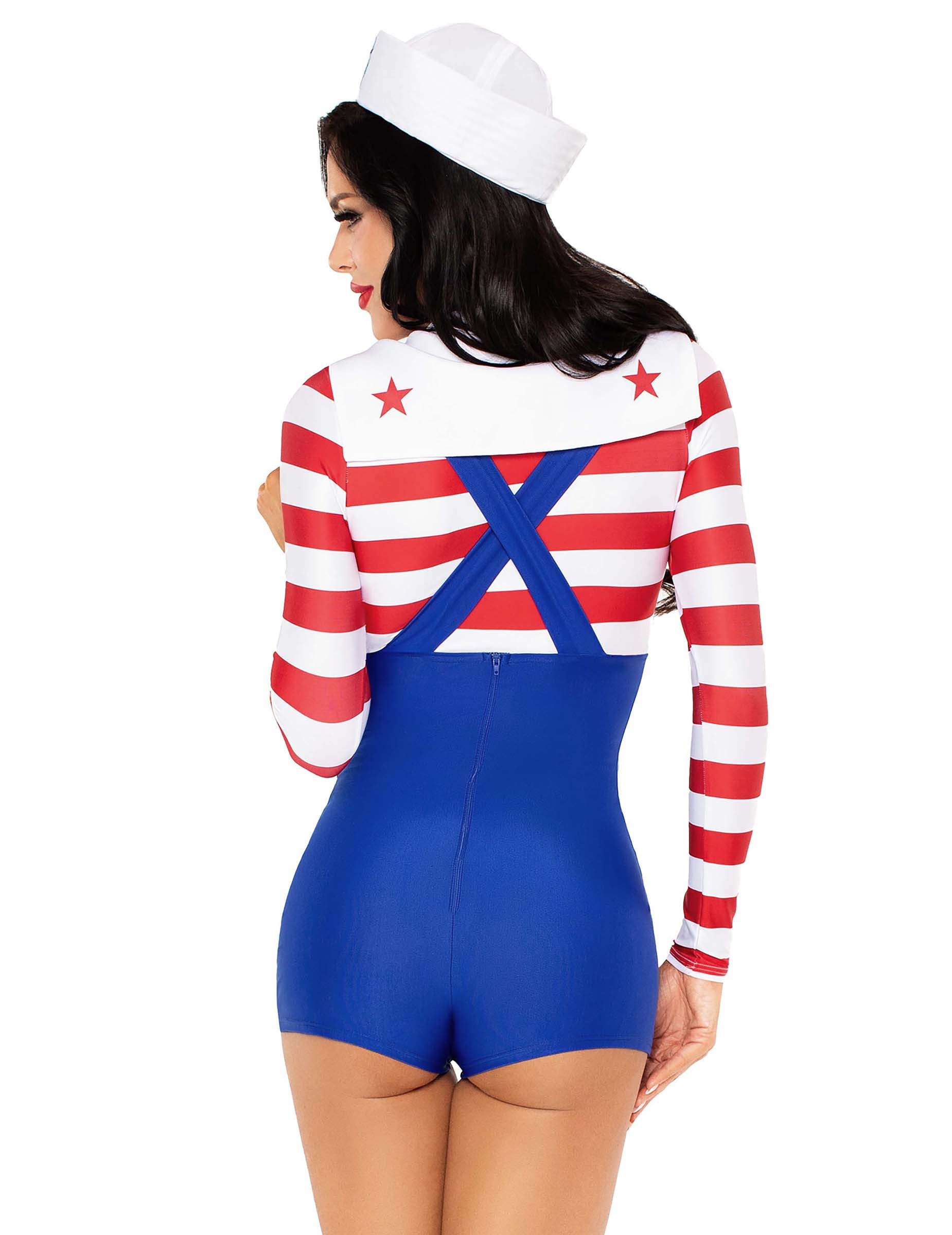 Ce déguisement marin rétro sexy pour femme se compose d’un combishort effet salopette bleue et d’un haut à rayures rouges et blanches cousu à l’ensemble. Le col blanc à l'encolure accentue le style vintage de cette tenue. Des boutons dorés décoratifs viennent structurer la partie salopette avec élégance. La tenue est complétée par une coiffe blanche ornée d’un emblème doré, idéale pour rappeler les tenues de commandement. Ce costume est parfait pour faire sensation lors de vos soirées à thème marin ou pour fêter Carnaval avec une touche rétro assumée.