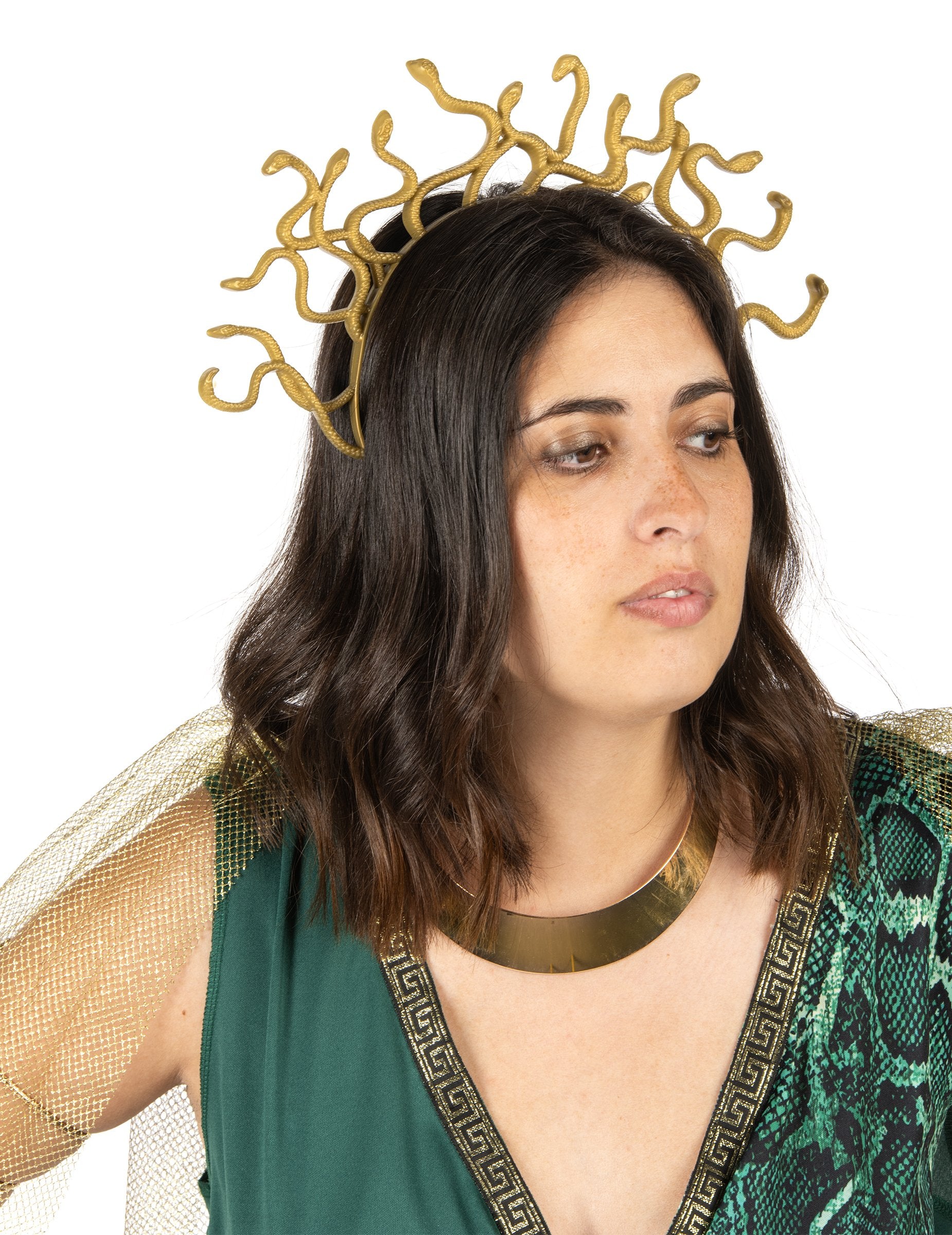 Outfit doplňuje zlatá čelenka ve tvaru hadů, připomínající legendu o Medúza, stvoření mytologický s obávaným pohledem.