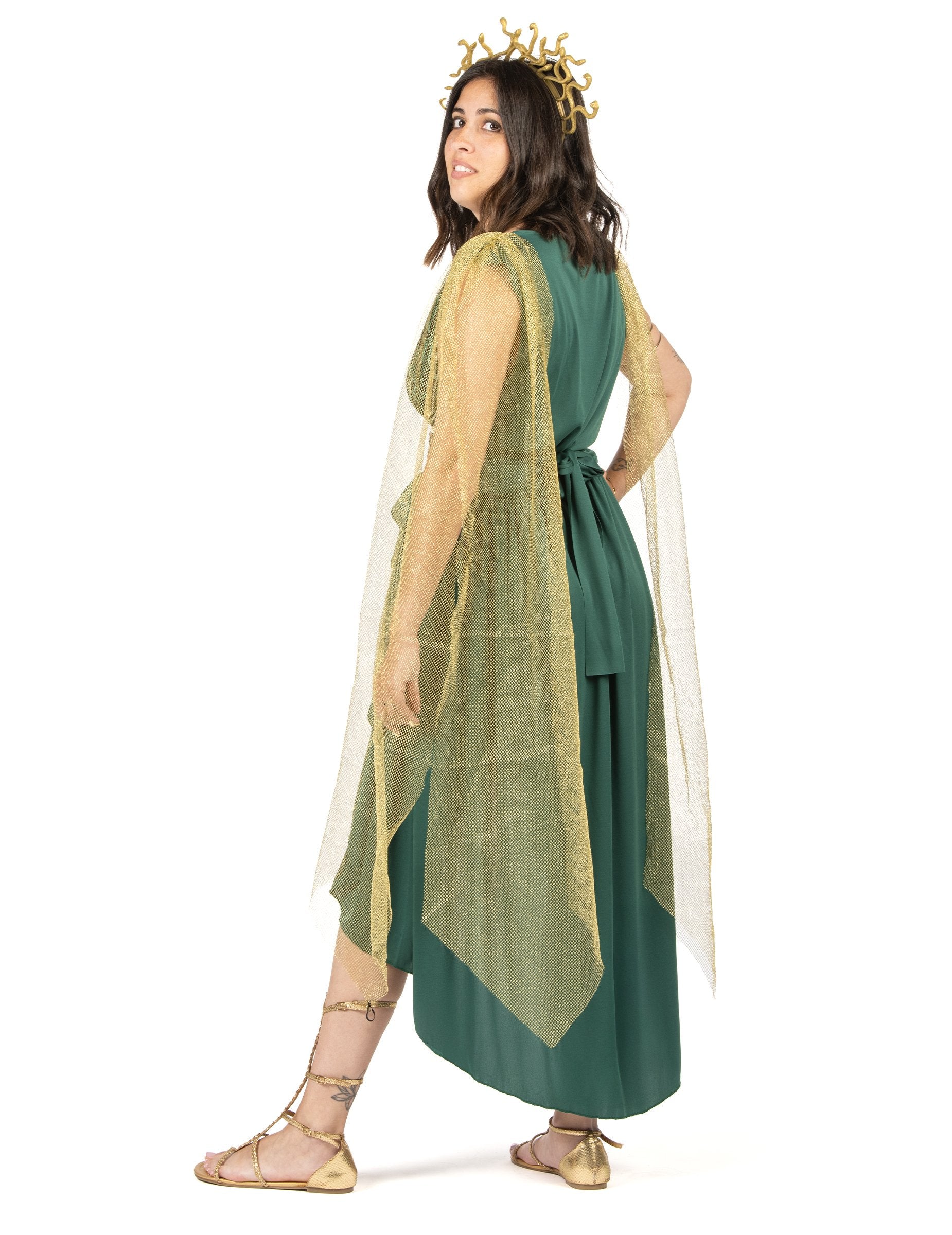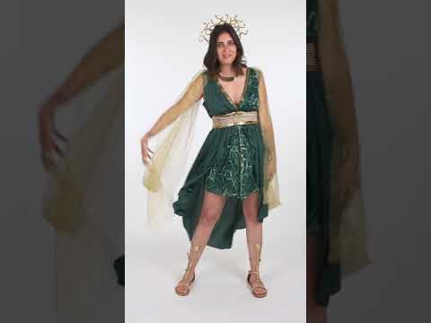 Toto Kostým bohyně Medúzy pro ženy zahrnuje splývavé zelené šaty s řaseným efektem, vylepšené vsadkou s hadím potiskem na přední straně. Zlatý pásek s řeckým motivem zvýrazňuje pas, zatímco na ramena jemně padá zlatá tylová pelerína.