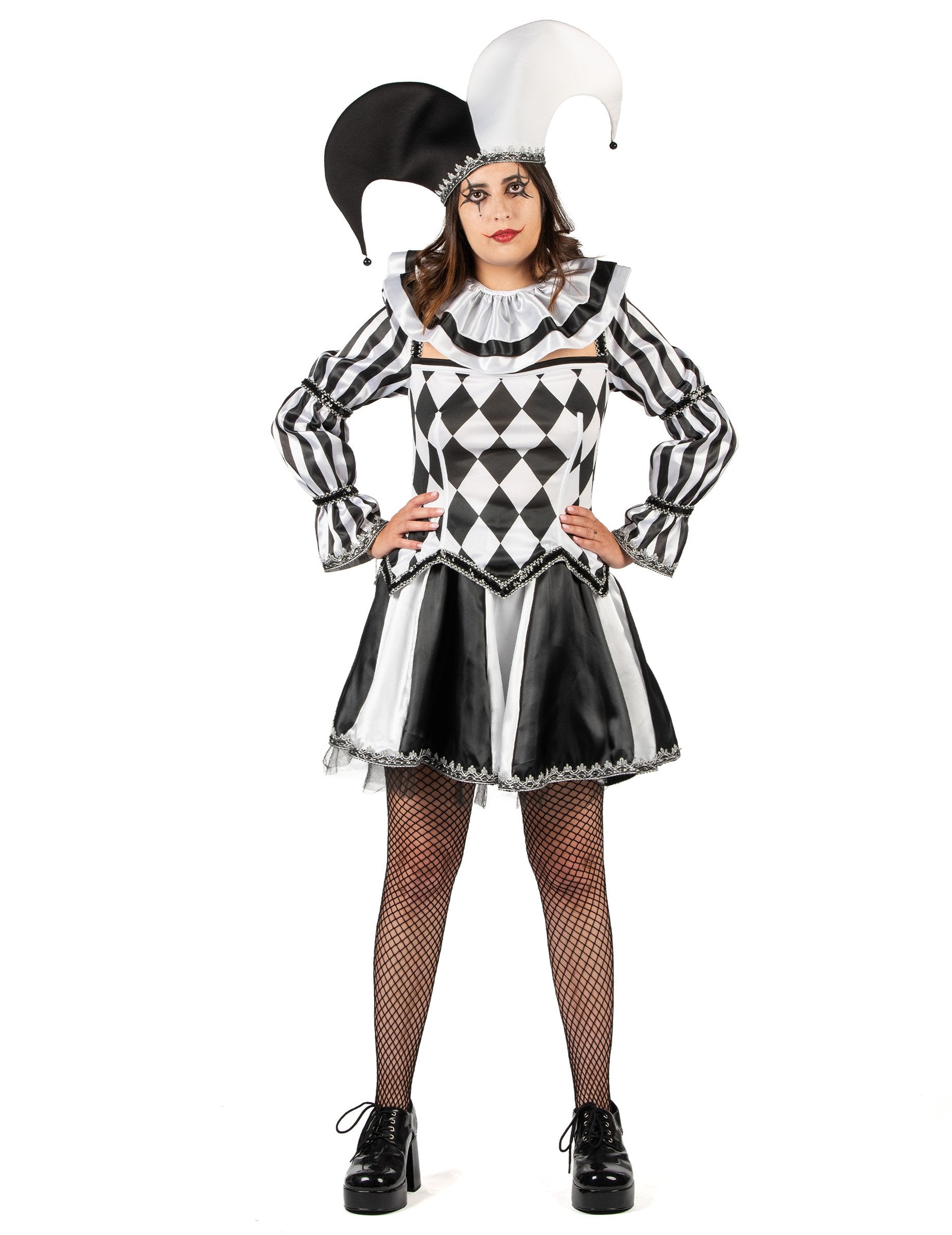 Tento dámský kostým ďábelského šaška v černobílé barvě upoutá pozornost svým mixem grafických vzorů a saténových materiálů. Vypasovaný vršek, ozdobený kosočtverci a svislými pruhy, zvýrazňuje siluetu a zároveň přidává špetku rozmarné elegance. Dlouhé rukávy jsou lehce nabírané a zvýrazněné lesklými lemovkami, což dodává objem a charakter. Krátká sukně z černobílé splývavé látky je podšitá černou tylovou spodničkou, která jí dodává tvar a podtrhuje nadýchaný efekt. Plisovaný límec stylově rámuje horní část hrudi, zatímco čepice zdobená rolničkami dokonale doplňuje výbavu postavy stejně rozpustilé jako záhadné. Tento kostým je ideální pro vytvoření originálního a znepokojivého vzhledu na Halloween.