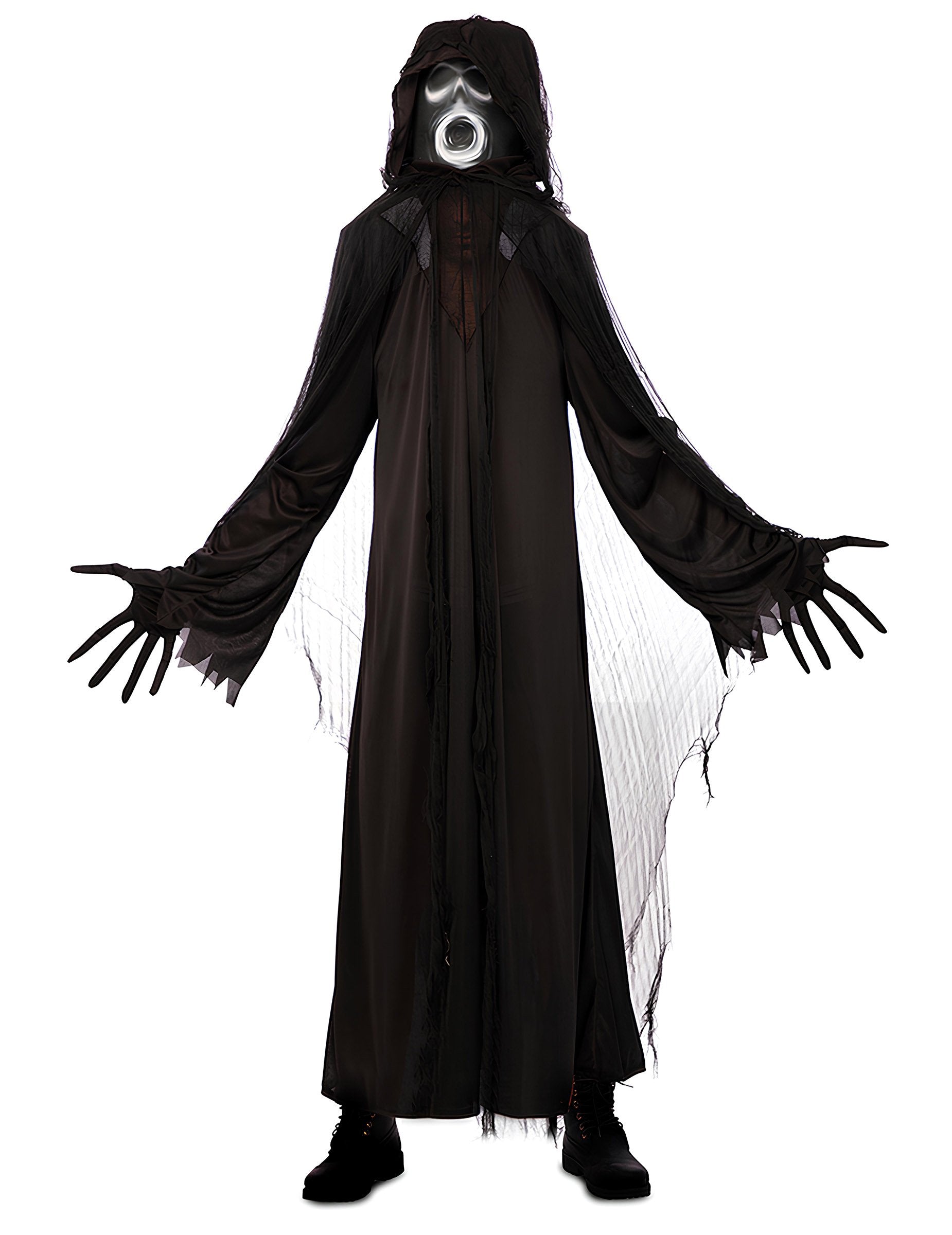 Tento dospělý kostým ducha se skládá z dlouhé černé tuniky s rozšířenými rukávy, vlnité pláště s roztrhanými okraji a přiléhavé pokrývky hlavy s vyobrazením přízračné tváře s doširoka otevřenými ústy. Splývavá tunika sahá až k chodidlům a vytváří dlouhý, tajemný vzhled. Roztřepené závoje zakrývají ramena a paže a zdůrazňují strašidelný efekt. Přilba tvoří šklebící se stříbrnou masku. Tento kostým je ideální pro strašení v halách o halloweenské noci a oživuje bytost z jiného světa.