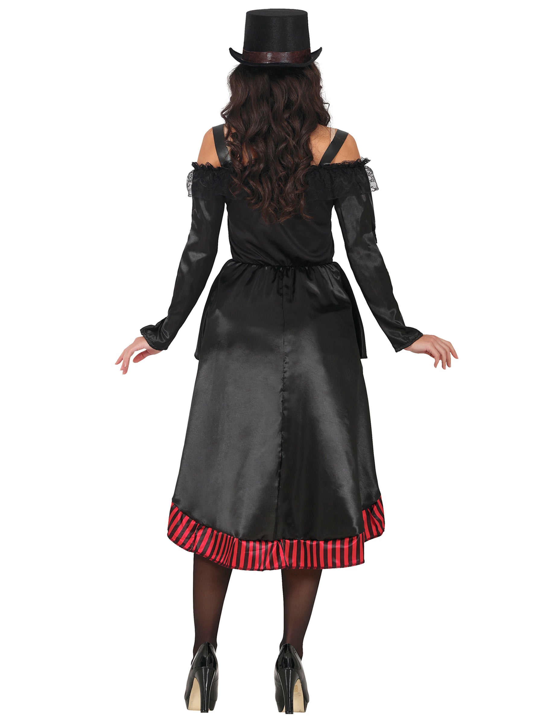 Tento gotický steampunk kostým pro ženy se skládá z asymetrických šatů s černým korzetovým živůtkem a červeno-černou pruhovanou nadýchanou sukní. Horní díl zdůrazňuje ramena spuštěnými ramínky, zatímco delší střih vzadu dodává kostýmu nádech dramatu. Tyto šaty, ideální na Halloween, ztělesňují steampunk estetiku s nádechem tajemna a jsou ideální pro večer, kdy se styl setkává s temnotou.