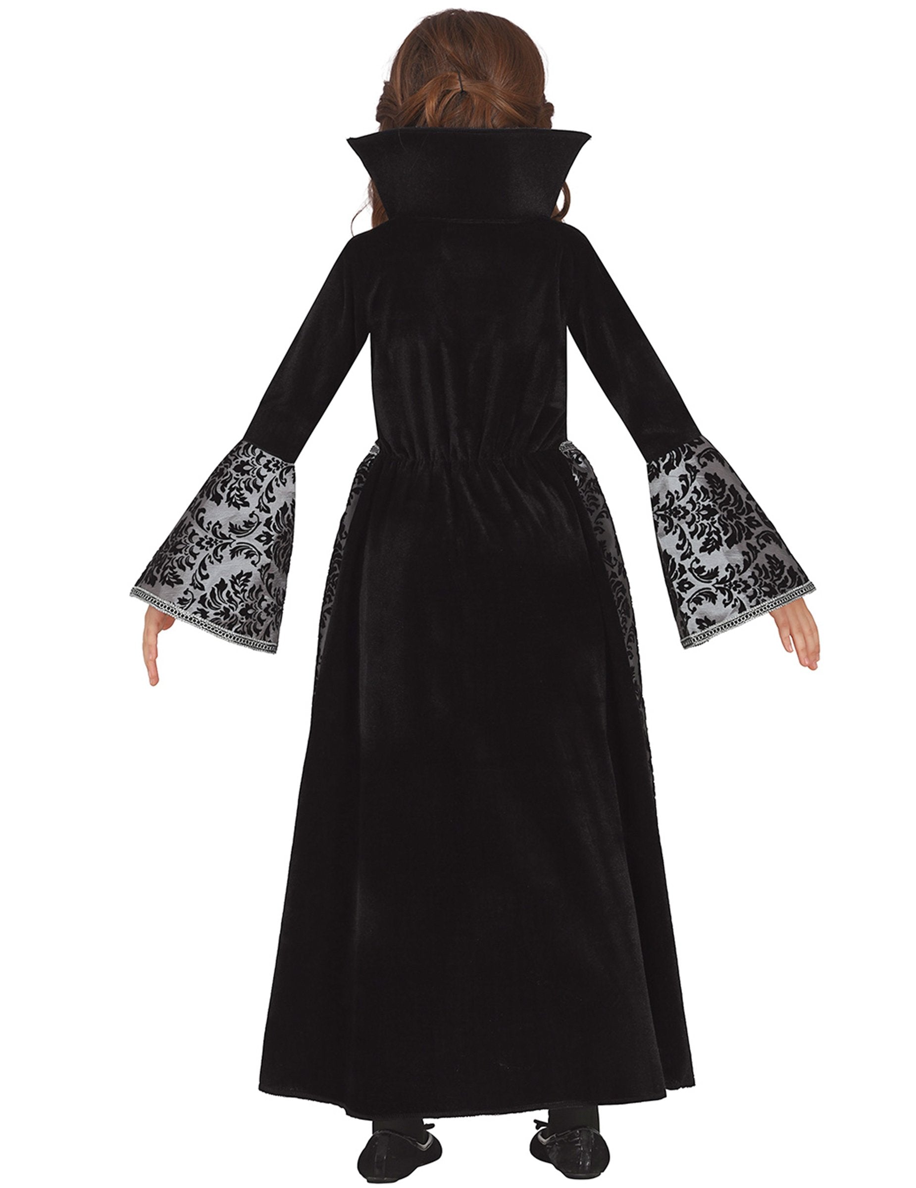 Ce déguisement de vampire argent pour fille se compose d’une robe longue noire et argentée, aux motifs baroques et aux manches évasées. Le col montant rigide apporte une touche mystérieuse, parfaite pour incarner une vampire royale. La coupe fluide et les détails argentés donnent à cette robe un style élégant et sombre, idéal pour Halloween.