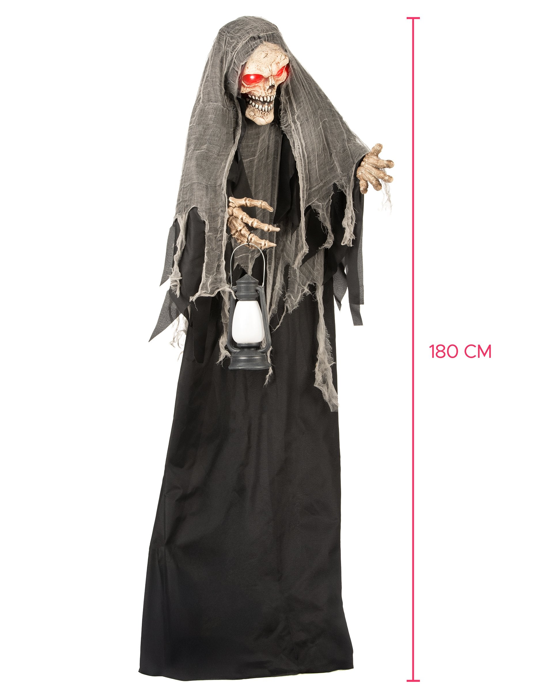 Vdechněte život těm nejhorším možným scénářům s touto 180° animovanou Smrtkou. cm přibližně kostlivý tvor zahalený v černém, který jako by bděl nad stíny. Jeho volné šaty, roztrhané závoje a lebka s rozzářenýma rudýma očima vytvářejí efekt stejně temný jako ohromující. Jakmile je slyšet zvuk, jeho integrovaný senzor spustí děsivou sekvenci. Jeho oči se rozsvítí, vydává ponuré zvuky a jeho hrozivé pohyby se aktivují, aby vytvořily atmosféru absolutního strachu. Dekorace je napájena 3 bateriemi AA (nejsou součástí balení) a nabízí trio efektů – světlo, zvuk a animaci. Tato brilantní ponurá smrtka se perfektně hodí na Halloween, do strašidelného domu, na pohlcující stezku nebo do ponurého prostředí a stane se skutečným vizuálním prvkem úzkosti ve vaší dekoraci.