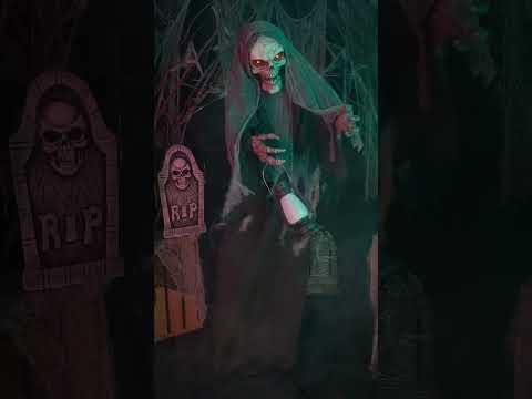 Oživte tím své nejhorší scénáře animovaná sekačka 180 cm přibližně, kostlivec zahalený v černém, který jako by hlídal ve stínu. Její volné šaty, roztrhané závoje a lebka s žhnoucím rudým pohledem vytvářejí efekt, který je stejně tmavý jako nápadný.