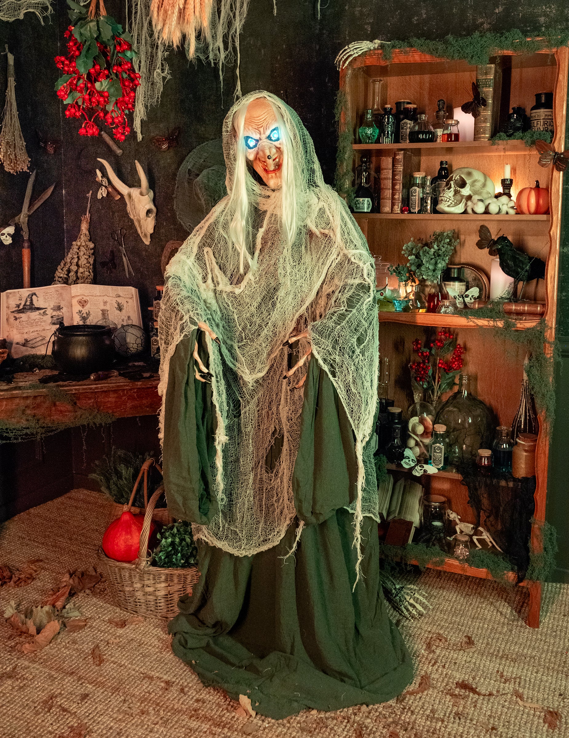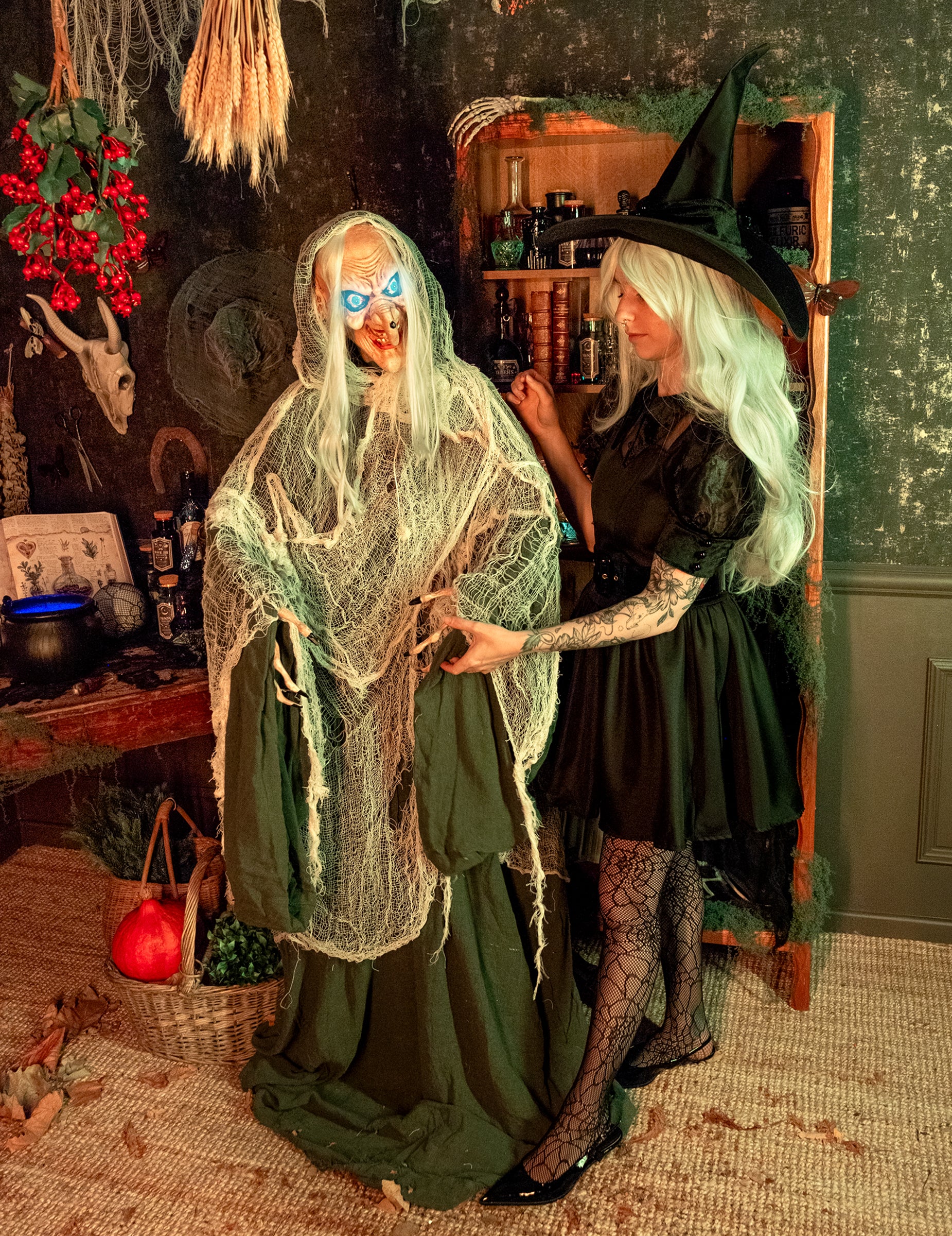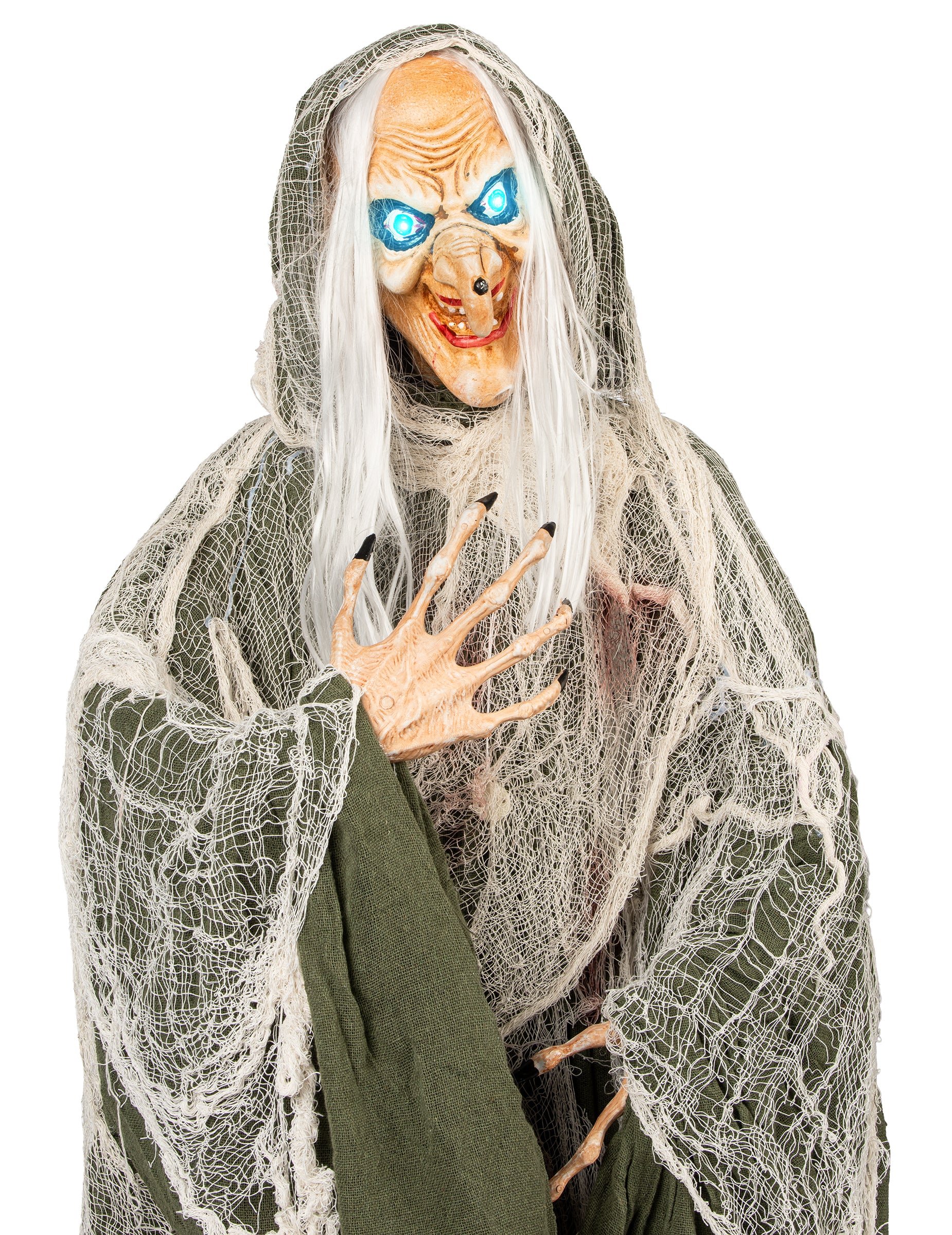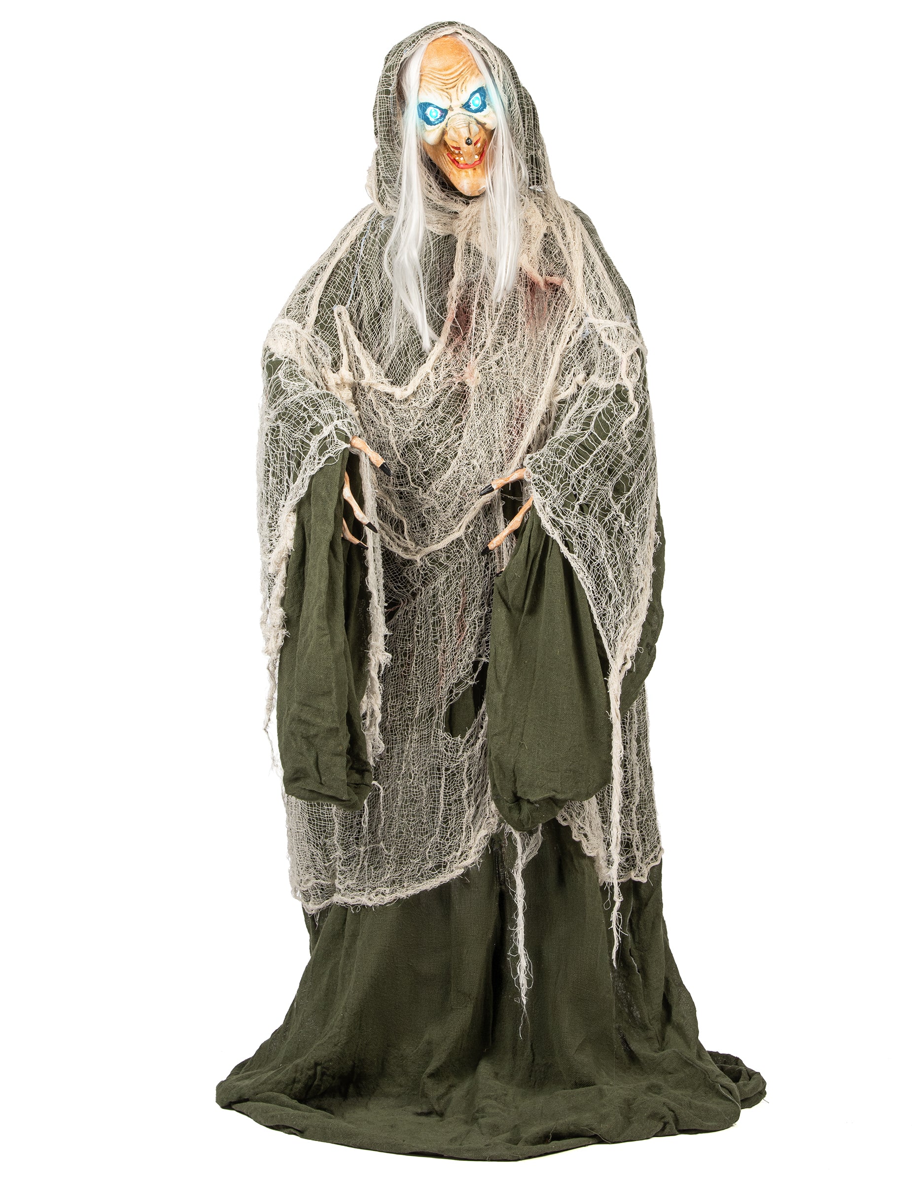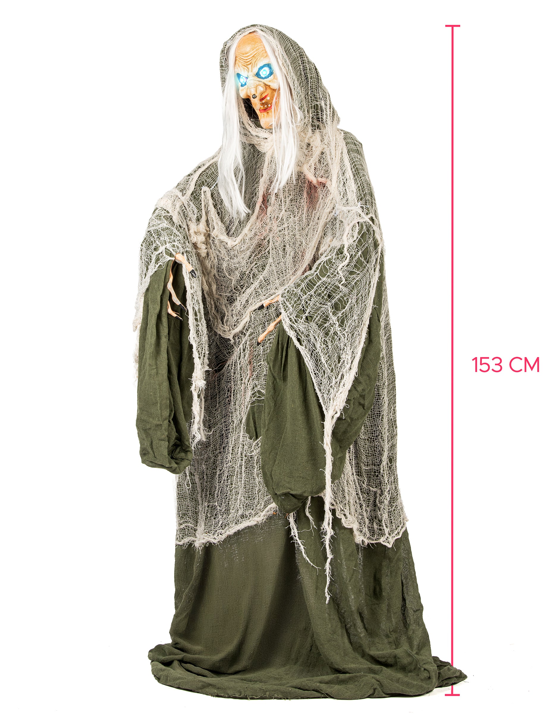 Tato animovaná čarodějnice ze 153 cm přibližně vystihuje Andromedu, znepokojivou postavu oblečenou v dlouhých, vybledlých zelených šatech a roztřepeném, starožitně vypadajícím šálu. Její časem ošuntělý obličej, zakončený zářivě modrýma očima, ožije, jakmile zachytí zvuk. Díky zvukovému senzoru se náhle aktivuje. Její pomalé, znepokojivé pohyby, zlověstné zvukové výbuchy a zářící oči vytvářejí okouzlující atmosféru. Dekorace je napájena 3 bateriemi AA (nejsou součástí balení) a kombinuje světlo, zvuk a animaci pro dokonalé ponoření. Tato čarodějnice s Andromedou je ideální na Halloween, temnou výlohu, temný kout strašidelného domu nebo událost zaměřenou na černou magii. Do vaší dekorace vnese vzrušení z tajemství a čarodějnictví.