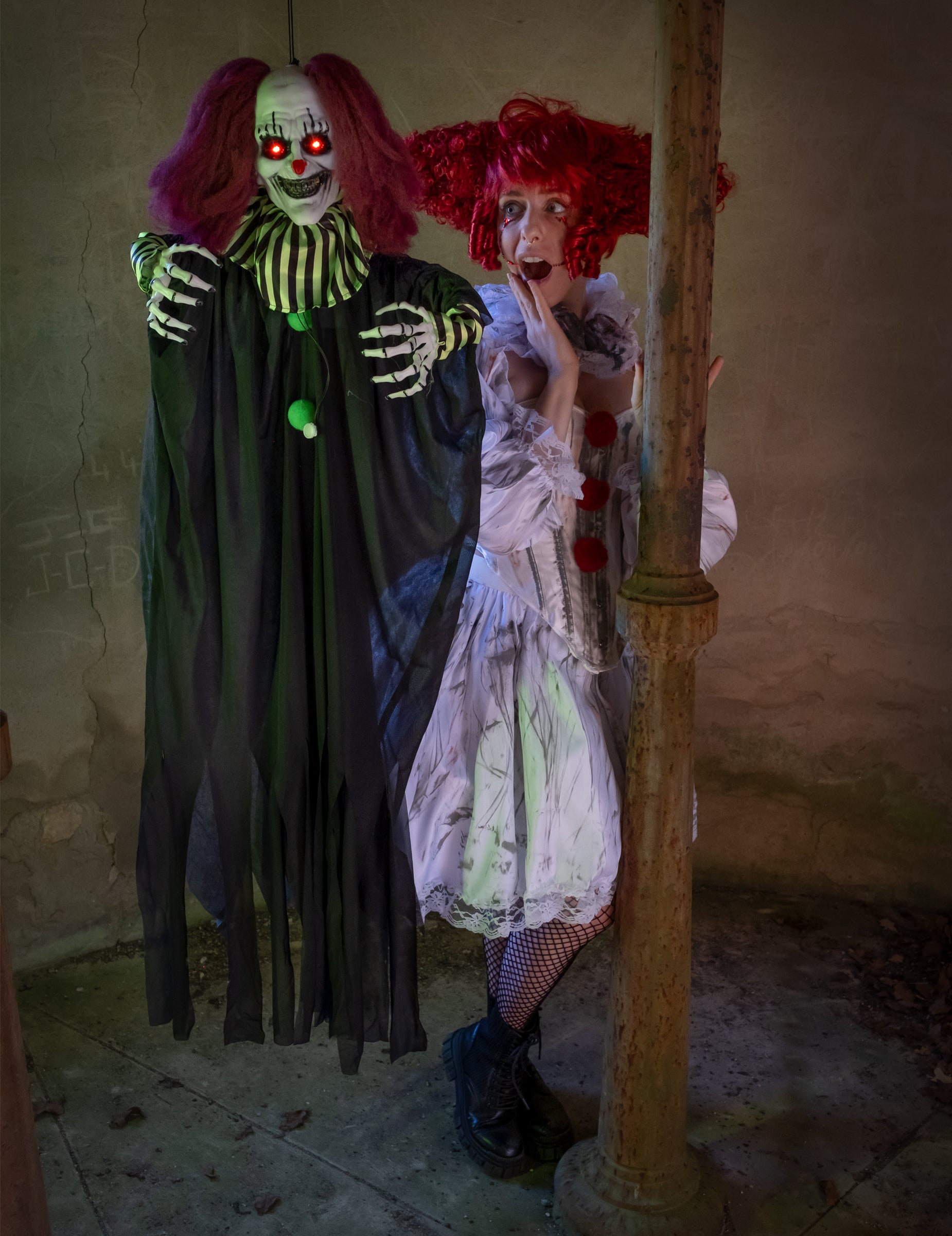 Přineste strach ze stropu s tímto animovaným závěsným klaunem o výšce 130 cm. cm přibližně makabrózní postava v zářivých barvách, která je vším, jen ne vtipná. S rozcuchanými rudými vlasy, neonově zeleno-černým kostýmem a kostnatou tváří ztuhlou v znepokojivé grimase přitahuje všechny pohledy. Jakmile uslyšíte zvuk, jeho zvukový senzor spustí horor. Rozsvítí se mu oči, ozvou se pronikavé zvuky a nastoupí panika. Lehký a snadno se zavěšuje, funguje na 3 baterie AAA (nejsou součástí balení) a nabízí výrazný kombinovaný světelný a zvukový efekt. Tento závěsný klaun je ideální pro halloweenskou výzdobu, místnost s morbidní atmosférou, animovanou výlohu nebo jakýkoli děsivý prostor a je připraven vám zmrazit krev při sebemenším zachvění.