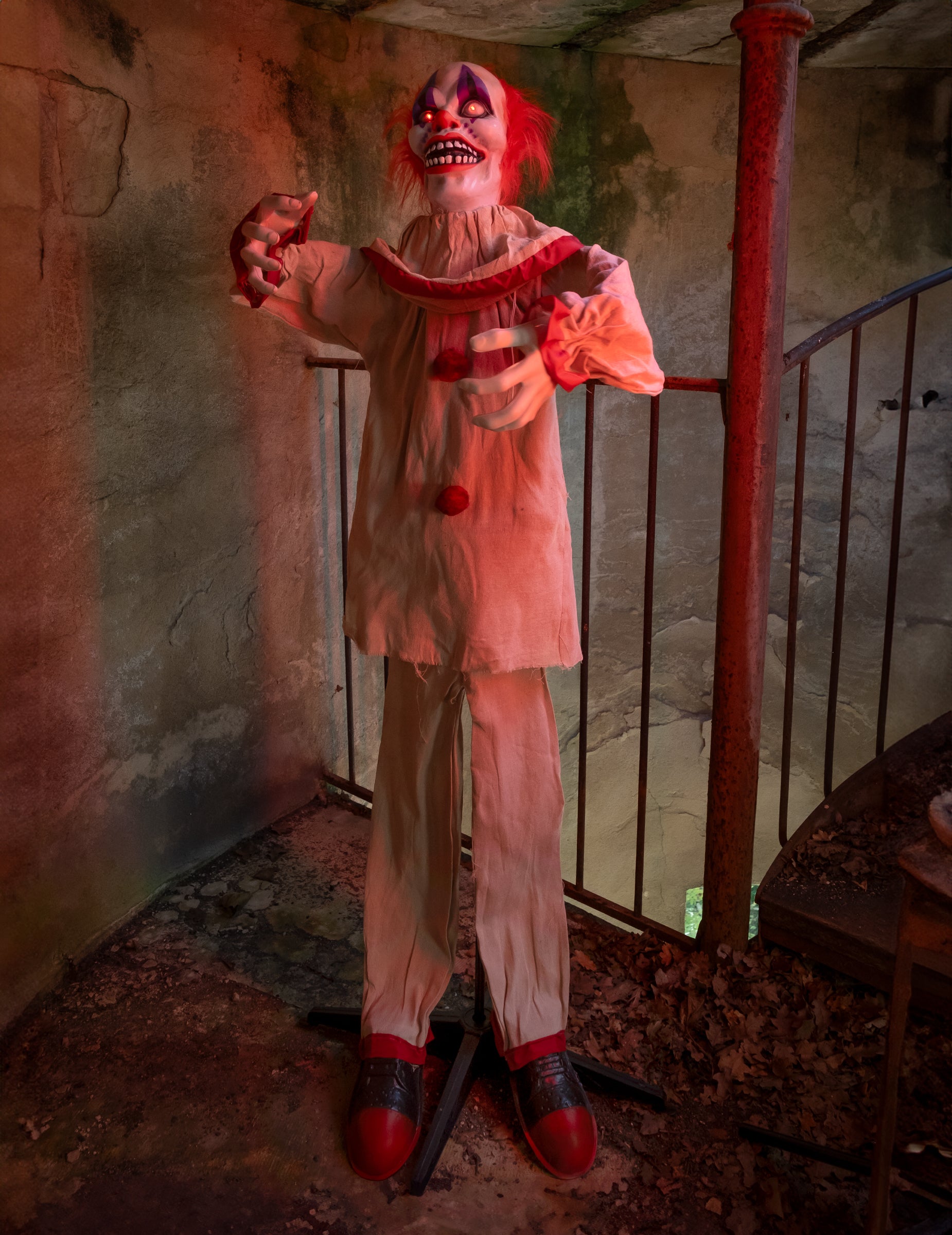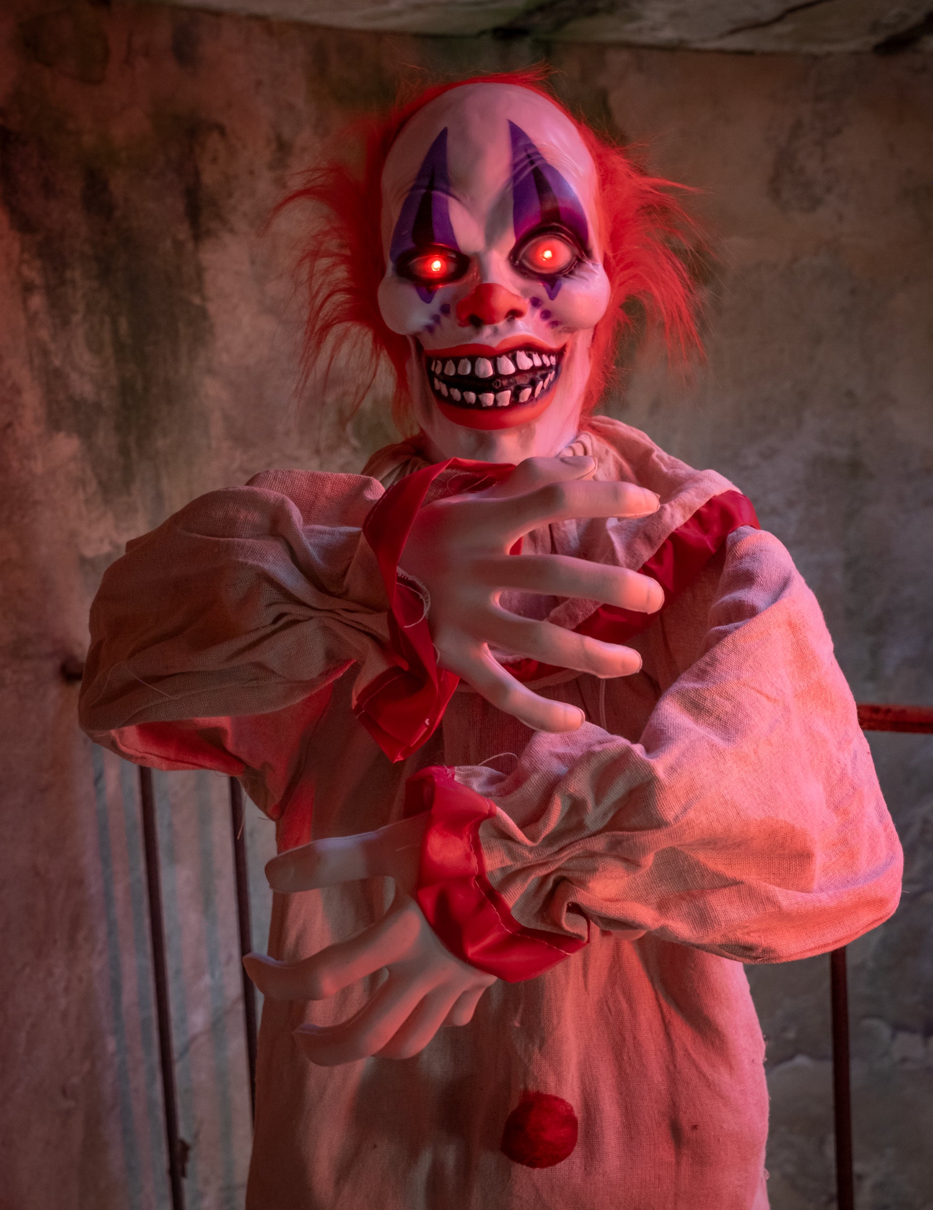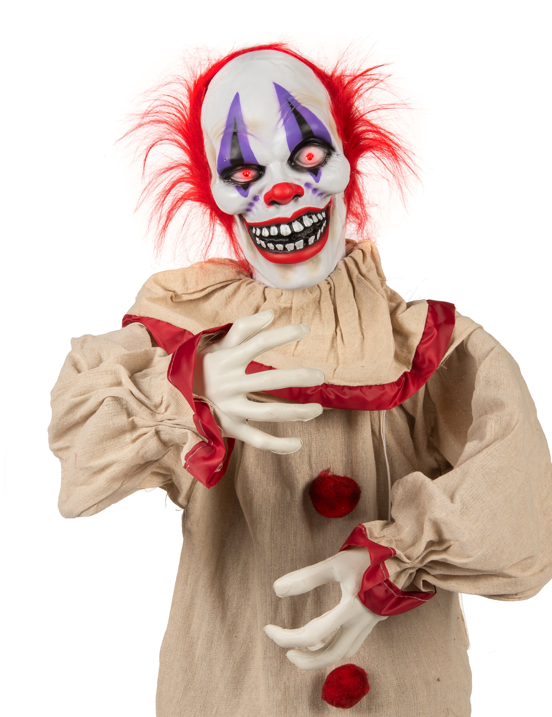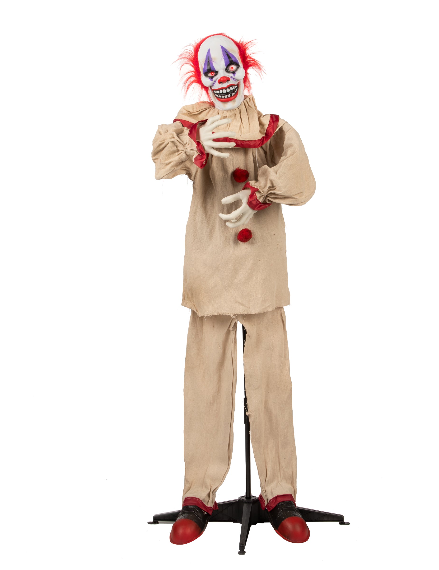 Dodá vaší scénografii nádech čisté hrůzy s tímto 153cm animovaným klaunem cm S upřeným a znepokojivým úsměvem, oblečená v béžovém obleku s červenými pruhy, s bledou tváří nalíčenou zlověstným způsobem a s zlověstnou přítomností, je tato postavička taková, že vám nahání mráz po zádech. Díky zvukovým a pohybovým senzorům se aktivuje, jakmile se k ní přiblíží návštěvník. Její oči září intenzivním světlem, znepokojivě se pohybuje a vydává děsivé zvuky. Dekorace vyžaduje 3 baterie AAA (nejsou součástí balení) pro skutečně úchvatný kombinovaný světelný, zvukový a animační efekt. Ideální pro strašidelný dům, halloweenskou párty, strašidelnou výlohu nebo morbidní klaunskou tématiku, tato postavička se rychle stane nejobávanější atrakcí v daném prostředí.