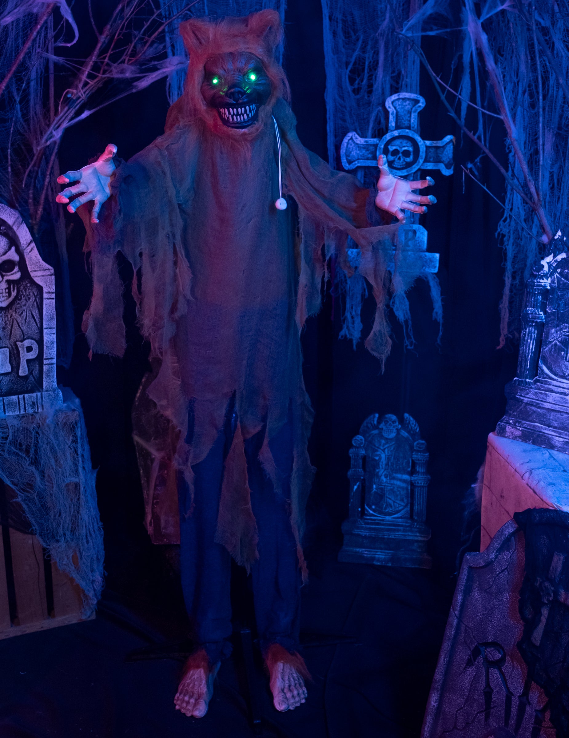 Vneste do svého interiéru strach s tímto animovaným obřím vlkem o 160° cm přibližně divoké zvíře s hrozivým pohledem a znepokojivou přítomností. Jeho rozcuchaná rudá srst, roztrhané oblečení a zuřivá tlama z něj dělají noční můru v životní velikosti. Jakmile zaznamená zvuk, senzor ho automaticky aktivuje. Rozsvítí se mu zelené oči, začne se náhlé pohyby a ozve se děsivé vytí. Celé to vytváří děsivou atmosféru, ideální pro překvapení vašich hostů. Dekorace funguje na 3 AA baterie (nejsou součástí balení). Tento animovaný vlk se perfektně hodí na Halloween, do strašidelného lesa nebo do pohlcující scény v děsivém domě a stane se jedním z nejobávanějších prvků vaší scény.