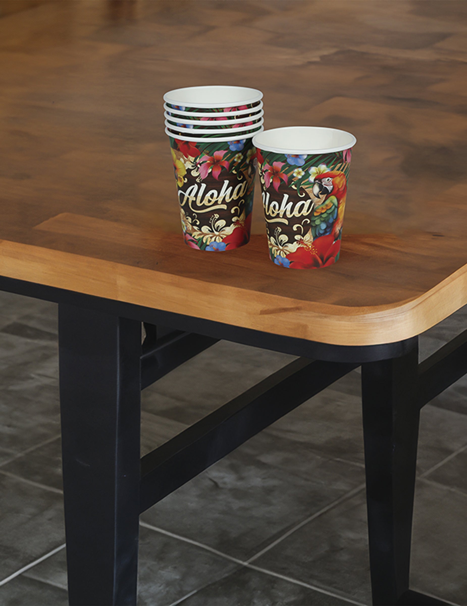 Tato sada 6 papírových kelímků Aloha Hawaiian o objemu 240 ml a výšce 9 cm je ideálním doplňkem slavnostní a barevné výzdoby. Tyto jednorázové kelímky s potiskem tropických květinových vzorů a exotických papoušků jsou navrženy tak, aby servírovaly studené nápoje a zároveň dodaly vašemu stolu slunečný nádech. Ideální pro zahradní párty, večer s ostrovní tematikou nebo letní narozeniny.