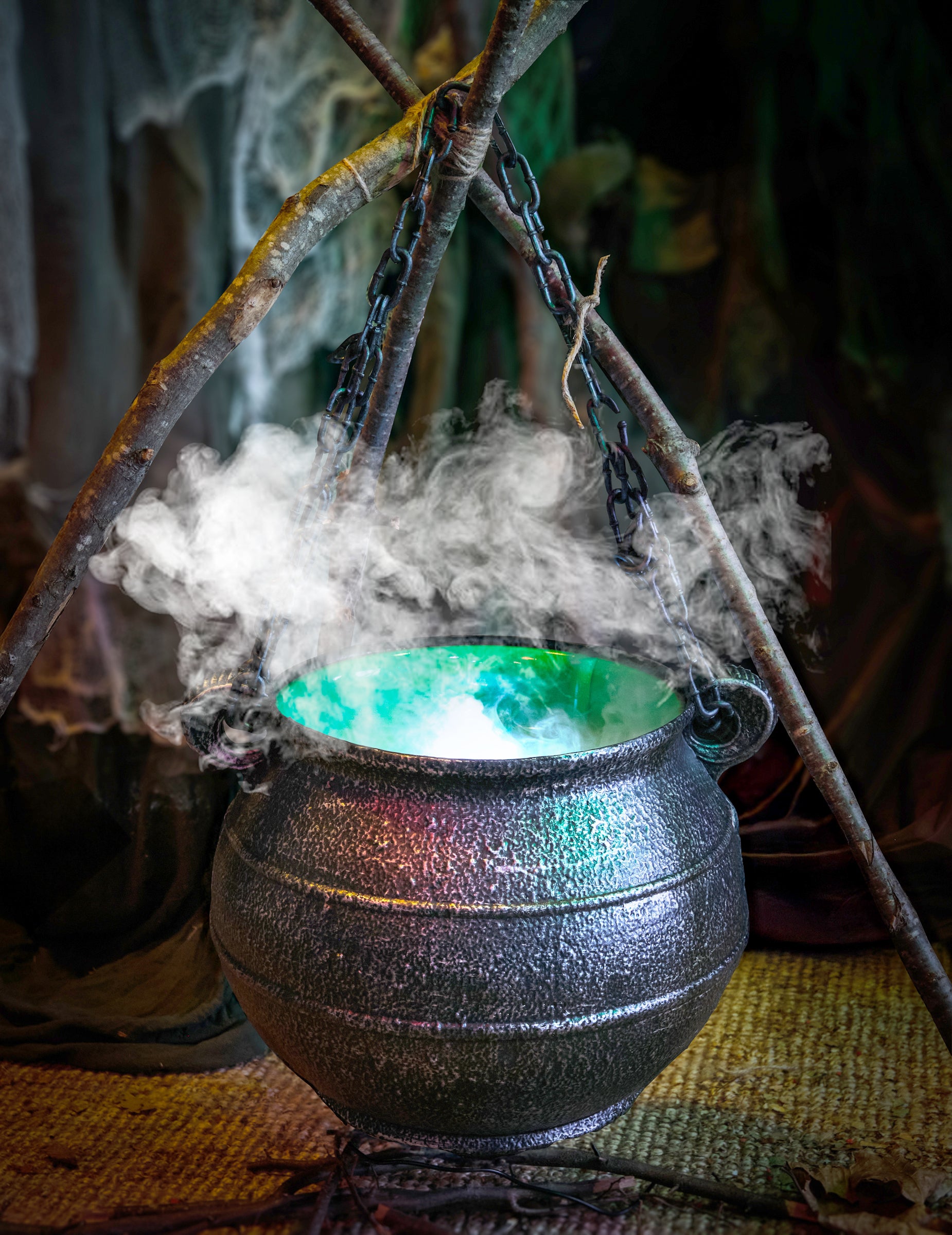 Tato čarodějnická konvice s mlžným ventilátorem 45 cm Toto je perfektní doplněk pro vytvoření nadpřirozené atmosféry ve vaší halloweenské výzdobě. Díky kouřovému efektu a tajuplné zelené záři vypadá tento texturovaný černý kotel, jako by vyšel přímo z doupěte čarodějnice. Vestavěný rozprašovač vytváří hustou, chladnou mlhu, která stoupá z kotle, zatímco vnitřní světlo vrhá tajuplnou záři simulující bublající lektvar. Ideální doplněk k scéně s čarodějnicí, knihou kouzel nebo koštětem. Jednoduše nalijte vodu do zelené základny. Funguje napájen ze zásuvky 220–240 V AC pro nepřetržité a nepřerušované rozptylování mlhy.