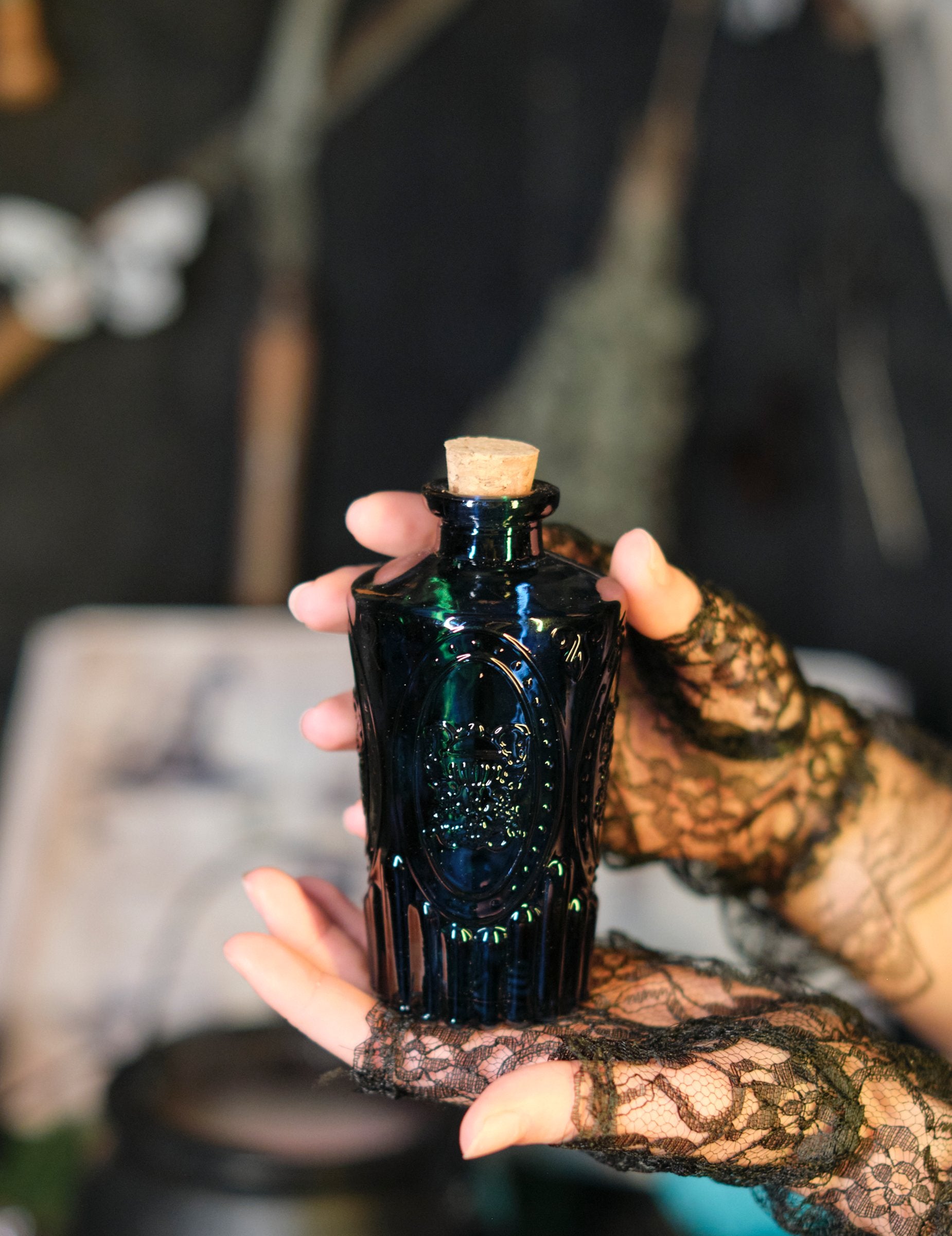 Tato dekorativní tmavě modrá skleněná lahvička měří 13,5 cm a spočívá na průměru 7 cm. Jeho reliéfní design v kombinaci s přírodní korkovou zátkou evokuje lektvary ze starověkých knih. Umístěný jako ústřední prvek nebo na kus nábytku, dokonale zapadne do halloweenského světa prodchnutého magií a tajemstvím.