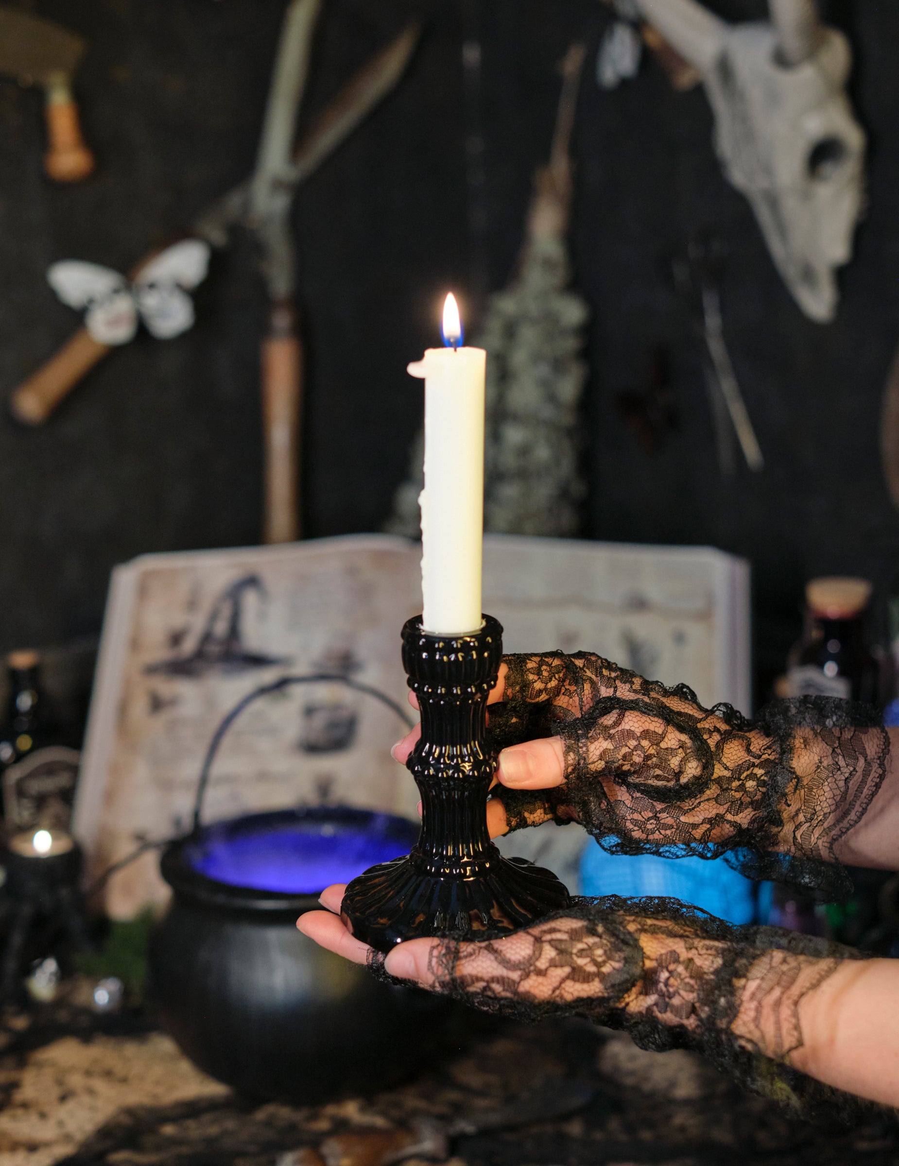 Tento černý skleněný svícen měří 12... cm a snadno se do něj vejde svícen. Jeho propracovaný tvar, zvýrazněný tmavě tónovaným sklem, z něj dělá dekorativní předmět s charakterem, ideální pro vaše halloweenské scény. Umístěný na stůl, polici nebo kus nábytku, šíří temnou a rafinovanou atmosféru.