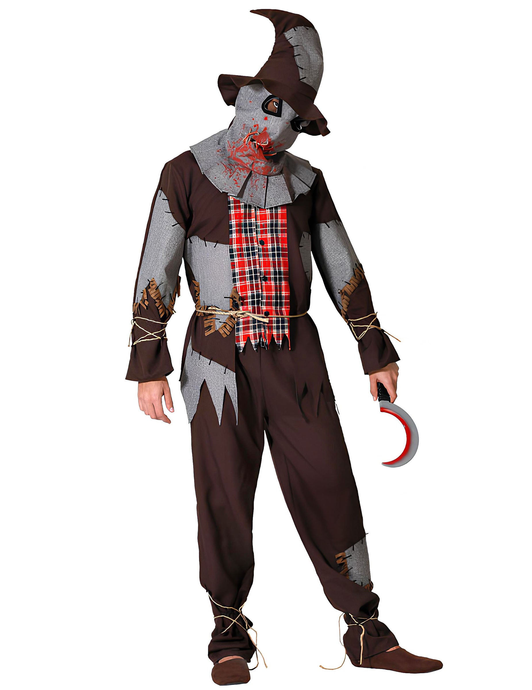Ce déguisement d’épouvantail ensanglanté pour homme se compose d’un haut à effet patchwork, d’un pantalon assorti, d’un chapeau pointu déformé, d’un masque macabre, d’une ceinture en corde et de liens pour poignets et chevilles. Le haut intègre un mélange de motifs écossais et de tissus déchirés, évoquant une silhouette effrayante tout droit sortie des champs maudits. Les manches et les jambes présentent un effet usé et effiloché, renforçant le caractère inquiétant de cette créature. Le masque, orné de traces de sang et d’une expression figée, vient accentuer l’horreur du personnage. Le chapeau, tordu et rapiécé, parachève l’allure effrayante de cet épouvantail possédé. Ce costume terrifiant est parfait pour semer l’effroi lors d’une soirée d'Halloween ou d’un événement déguisé.