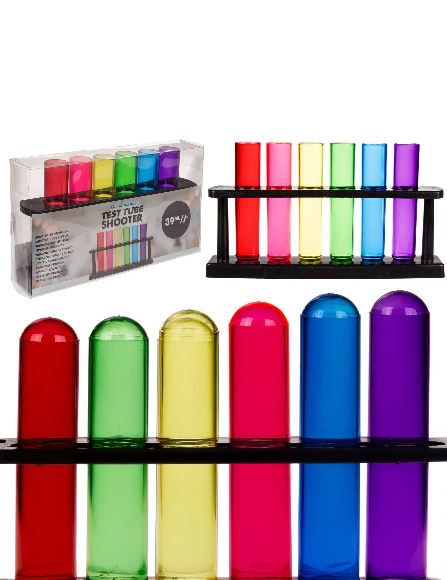 Každá zkumavka má válcový tvar připomínající laboratorní sklo s různými viditelnými barvami, jako je červená, růžová, žlutá, zelená, modrá a fialová. Trubky jsou drženy vzpřímeně na černé podložce, což usnadňuje jejich umístění na stůl nebo bar. Celé to vytváří vizuální efekt připomínající vědecký vesmír a přitom zůstává jednoduchý na použití během večera.