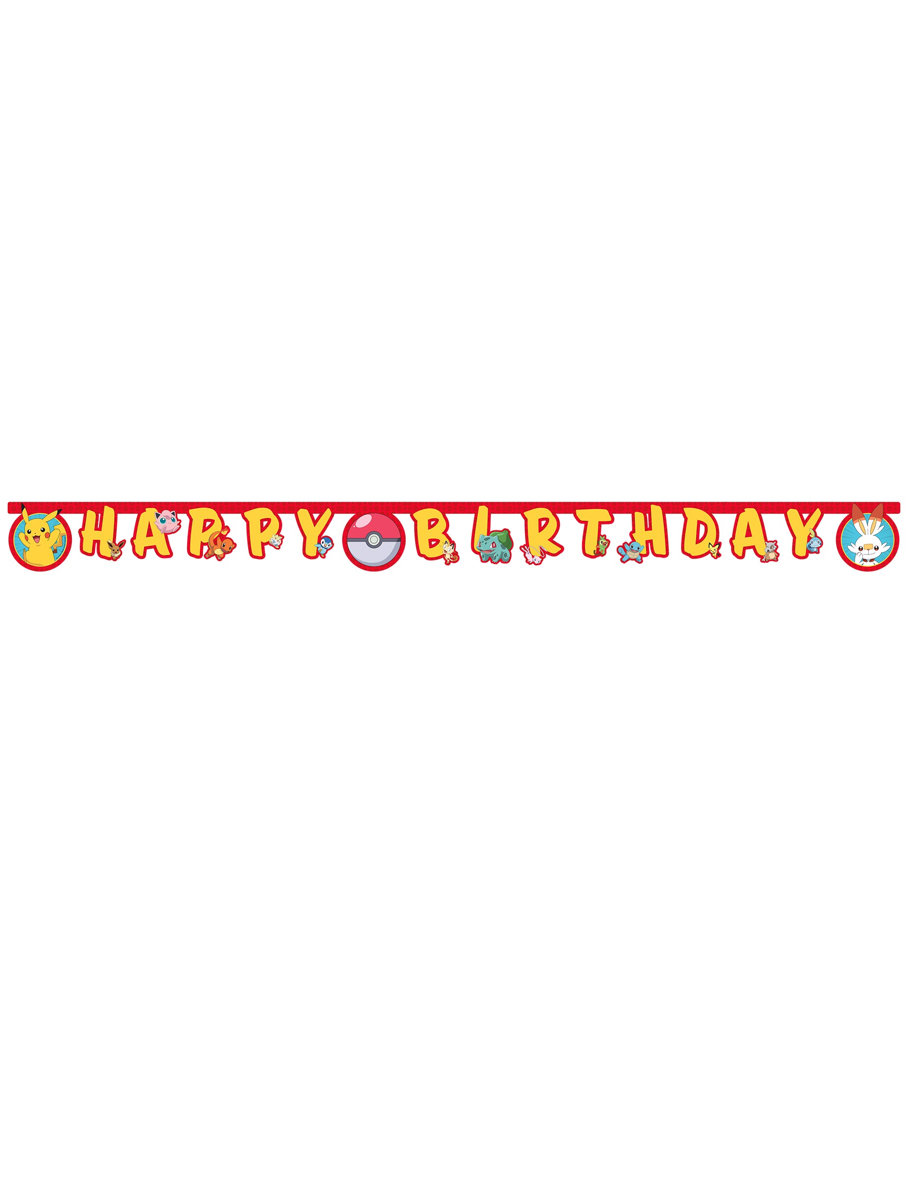 Toto narozeninová girlanda v barvách Pokémon™ obsahuje slavné Pikachu, Squirtle, Bulbasaur, Eevee a Charmander, obklopující písmena "Všechno nejlepší k narozeninám"plný energie.
