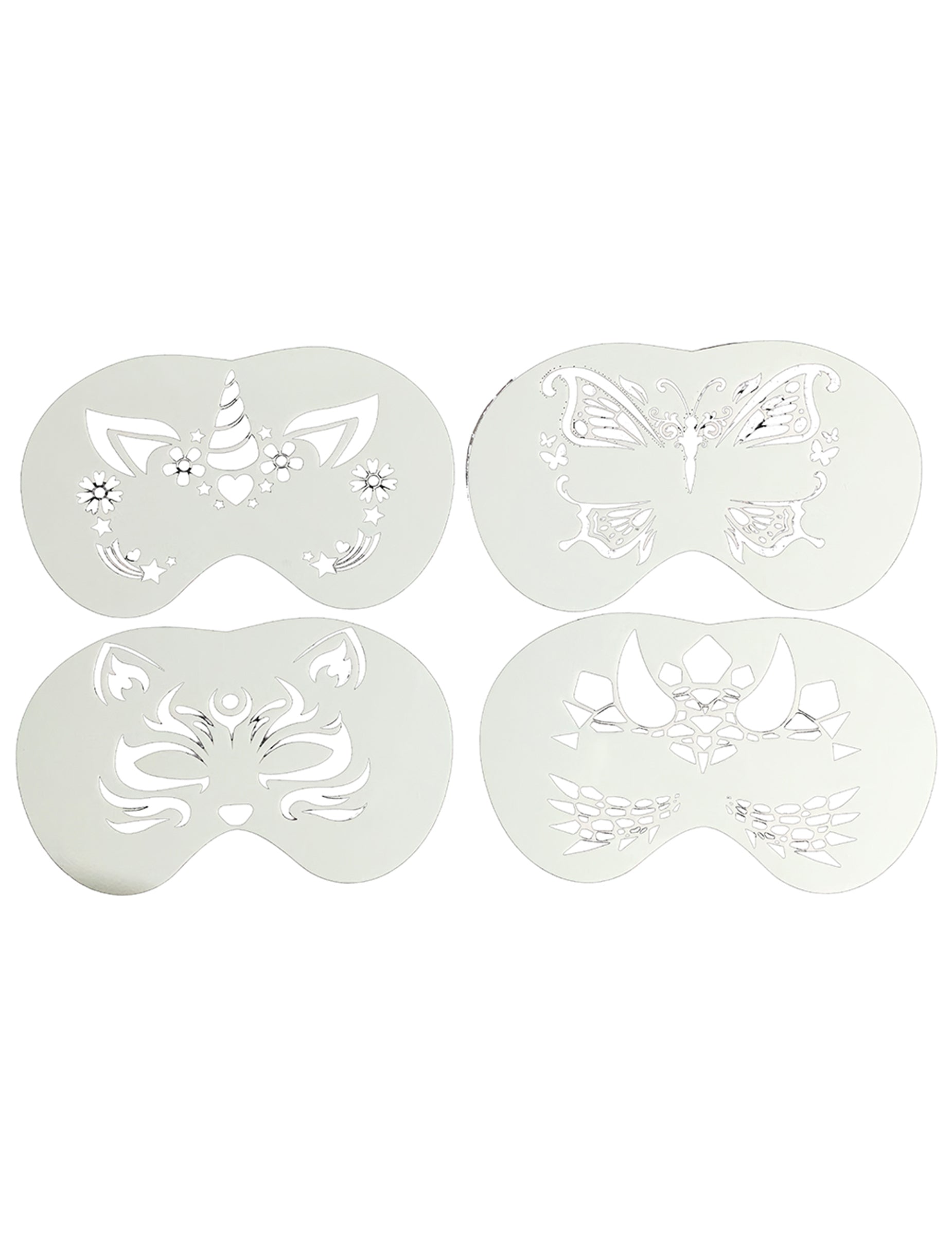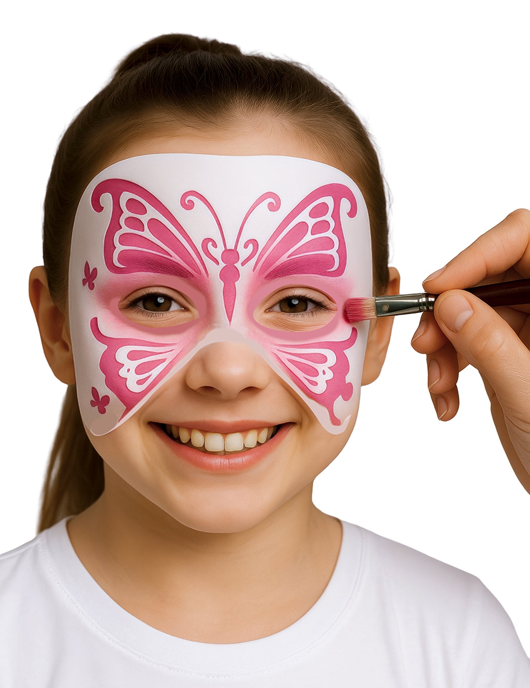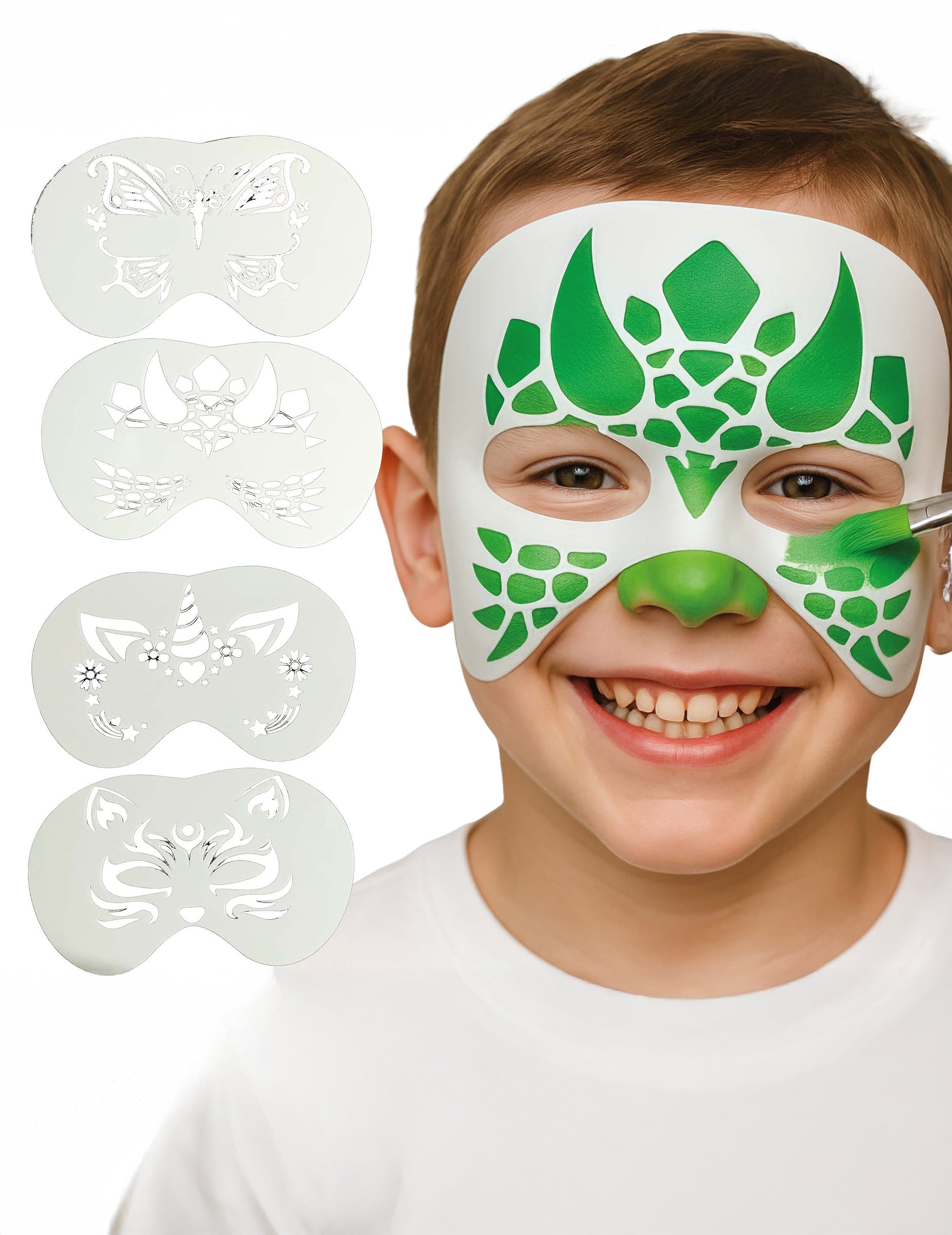 Tato sada obsahuje čtyři opakovaně použitelné šablony speciálně navržené pro děti. Umožňují vám rychle vytvořit originální malování na obličej ve tvaru draka/dinosaura, motýla, jednorožce a kočky. Díky přesnému výřezu se snadno nanášejí na obličej a zaručují čistý výsledek i pro začátečníky. Tyto šablony jsou ideální pro narozeniny, karnevaly, školní večírky nebo Halloween a zajišťují zábavné, rychlé a kreativní malování na obličej.