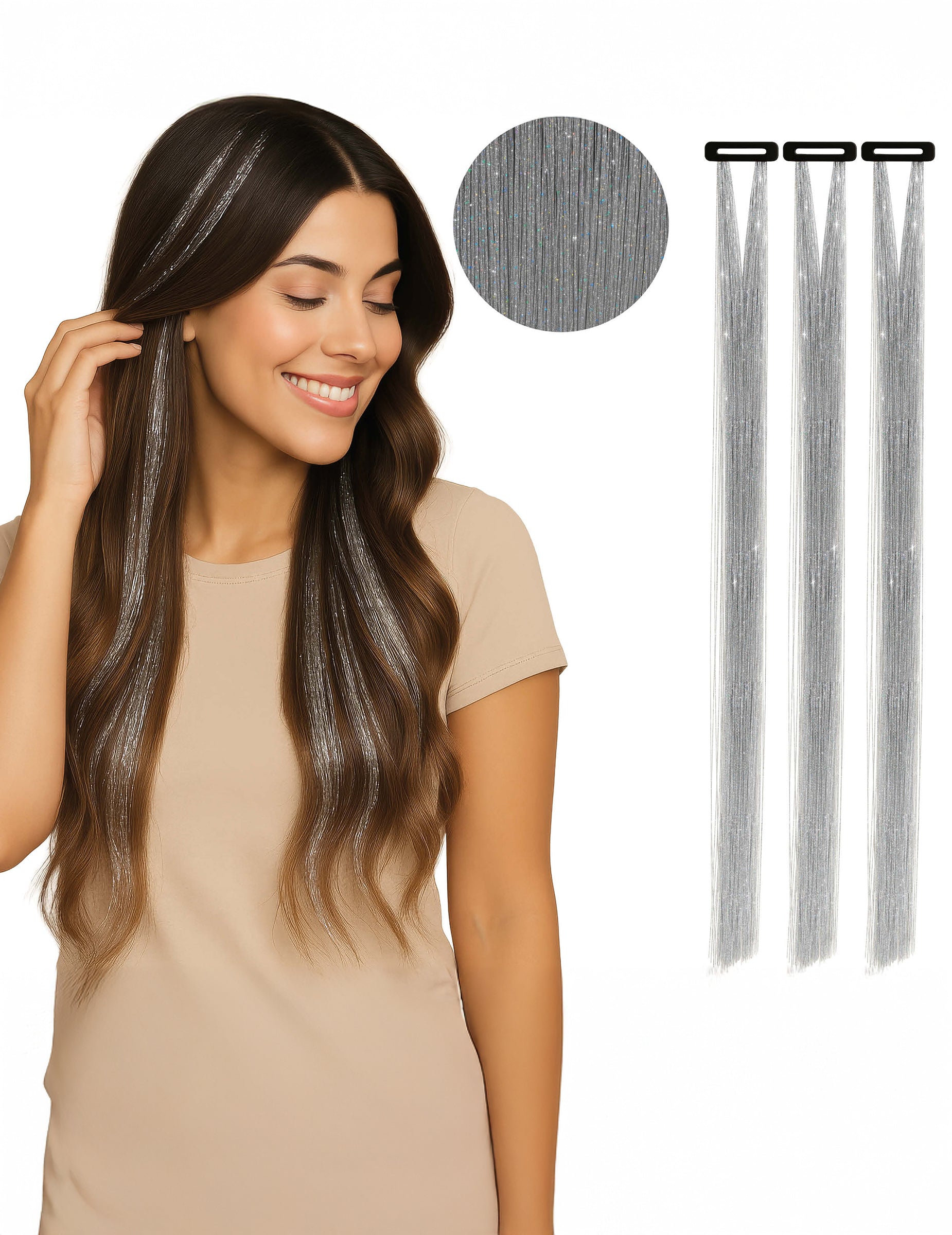 Ajoutez une touche glamour à vos coiffures avec ces 3 mèches brillantes argentées de 50 cm. Faciles à fixer grâce à leur système à clipser, elles apportent immédiatement éclat et originalité à vos cheveux. Idéales pour compléter un déguisement, briller lors d’une soirée, d’un festival ou simplement sublimer votre style, ces mèches scintillantes se marient parfaitement à toutes les tenues festives. Leur effet argenté reflète la lumière pour un rendu spectaculaire et raffiné.