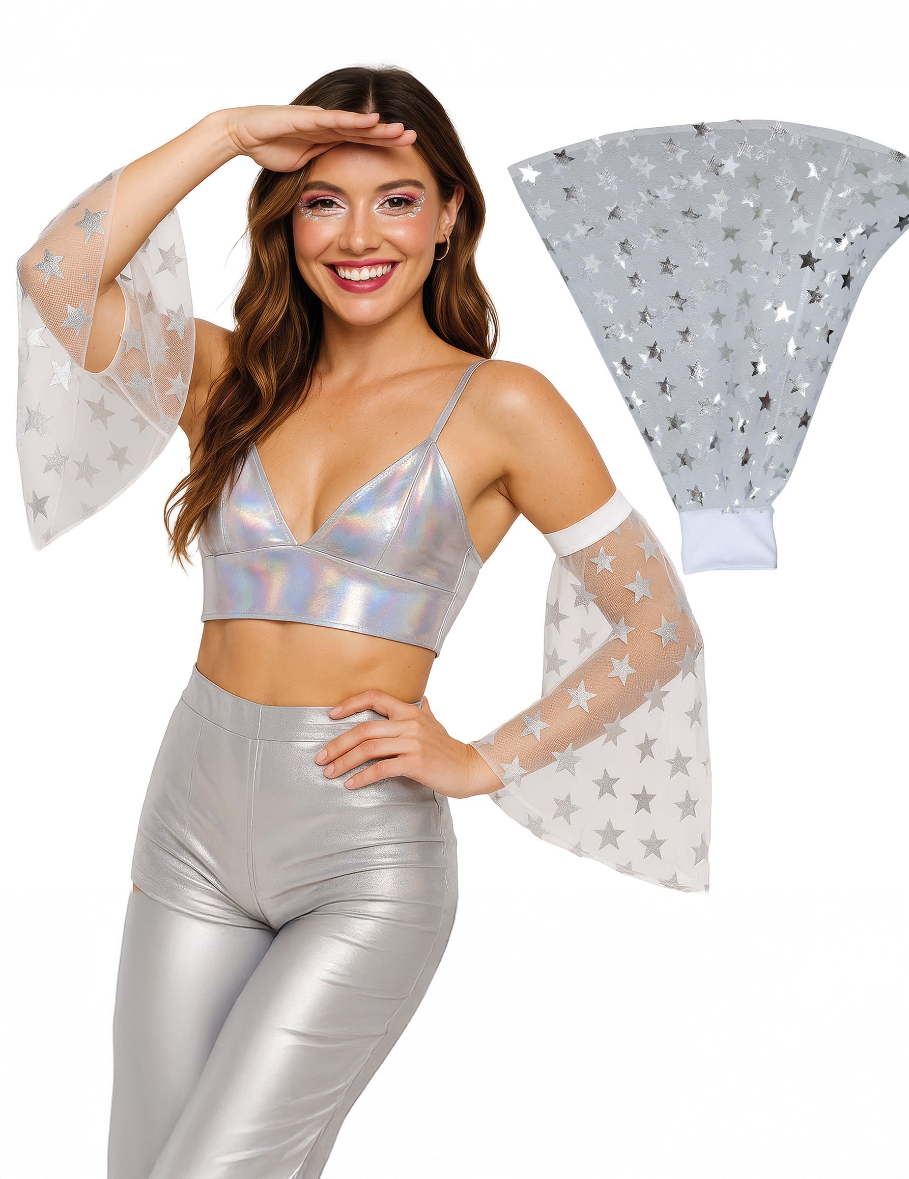 Přidejte svému kostýmu třpytivý nádech s těmito stříbrnými disco manžetami zdobenými zářivými hvězdami. Jsou vyrobené z lehkého průhledného voálu a díky elastickému zápěstí se snadno nosí, což zaručuje pohodlí a držení po celý večírek. Ideální na disco party, festival, maškarní večírek nebo karneval, rozzáří vaše pohyby a podtrhnou vaše taneční gesta.