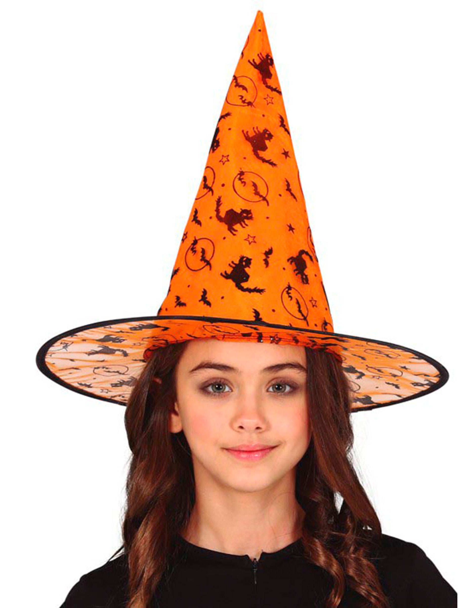 Tento oranžovo-černý špičatý klobouk je dokonalým doplňkem pro dětský čarodějnický kostým. Je ozdoben černými motivy netopýrů, koček a čarodějnic, které vytvářejí vzhled, jenž je zároveň strašidelný i zábavný. Jeho protáhlý tvar a široká krempa dodávají kostýmu klasický nádech, ideální pro magický a slavnostní vzhled.