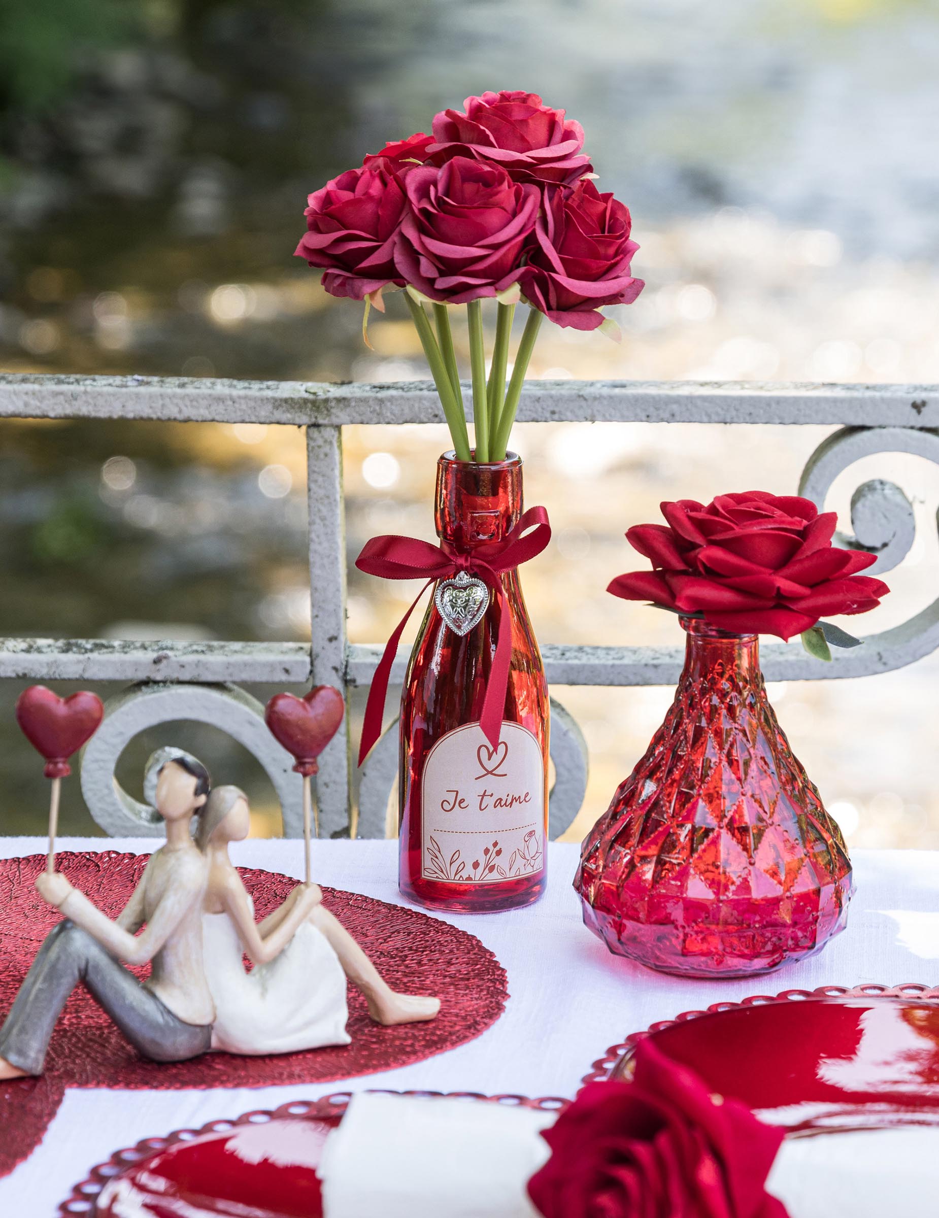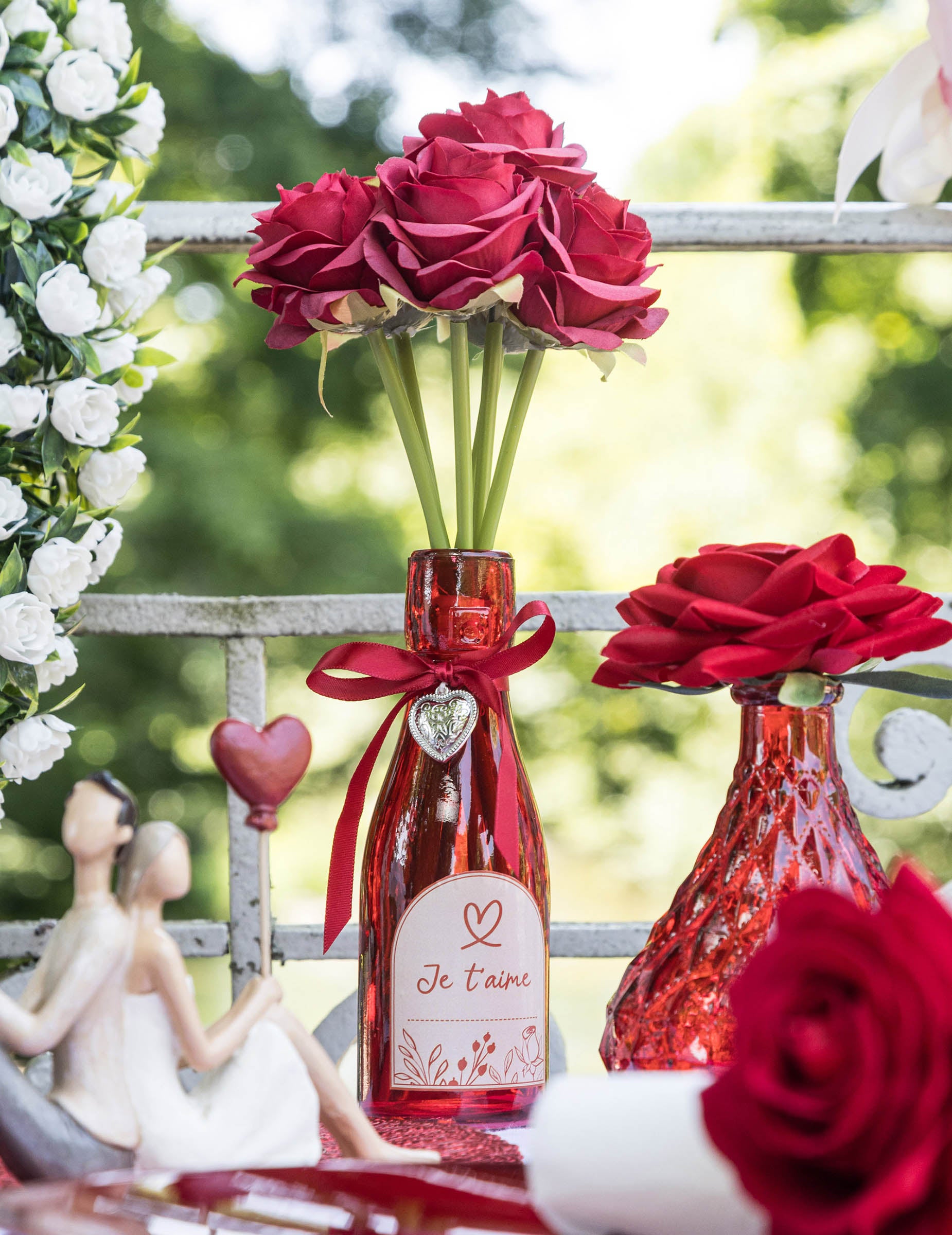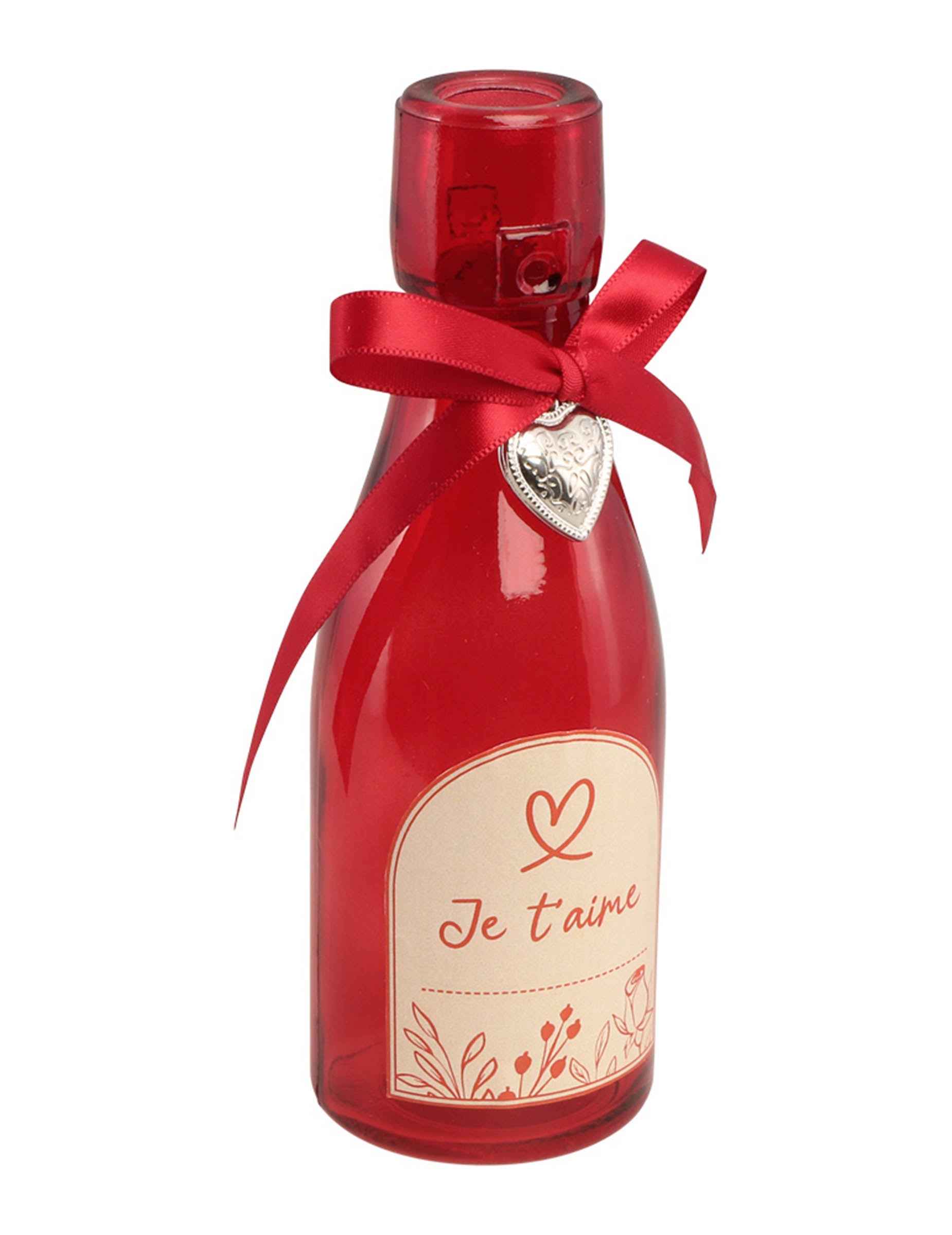 Vyjádřete své city elegantně díky této dekorativní skleněné lahvi v červené barvě 16 cm. Ozdobená saténovou stuhou, stříbrným přívěskem ve tvaru srdce a etiketou s něžným vzkazem „Miluji tě“, představuje dokonalý symbol lásky a romantiky.