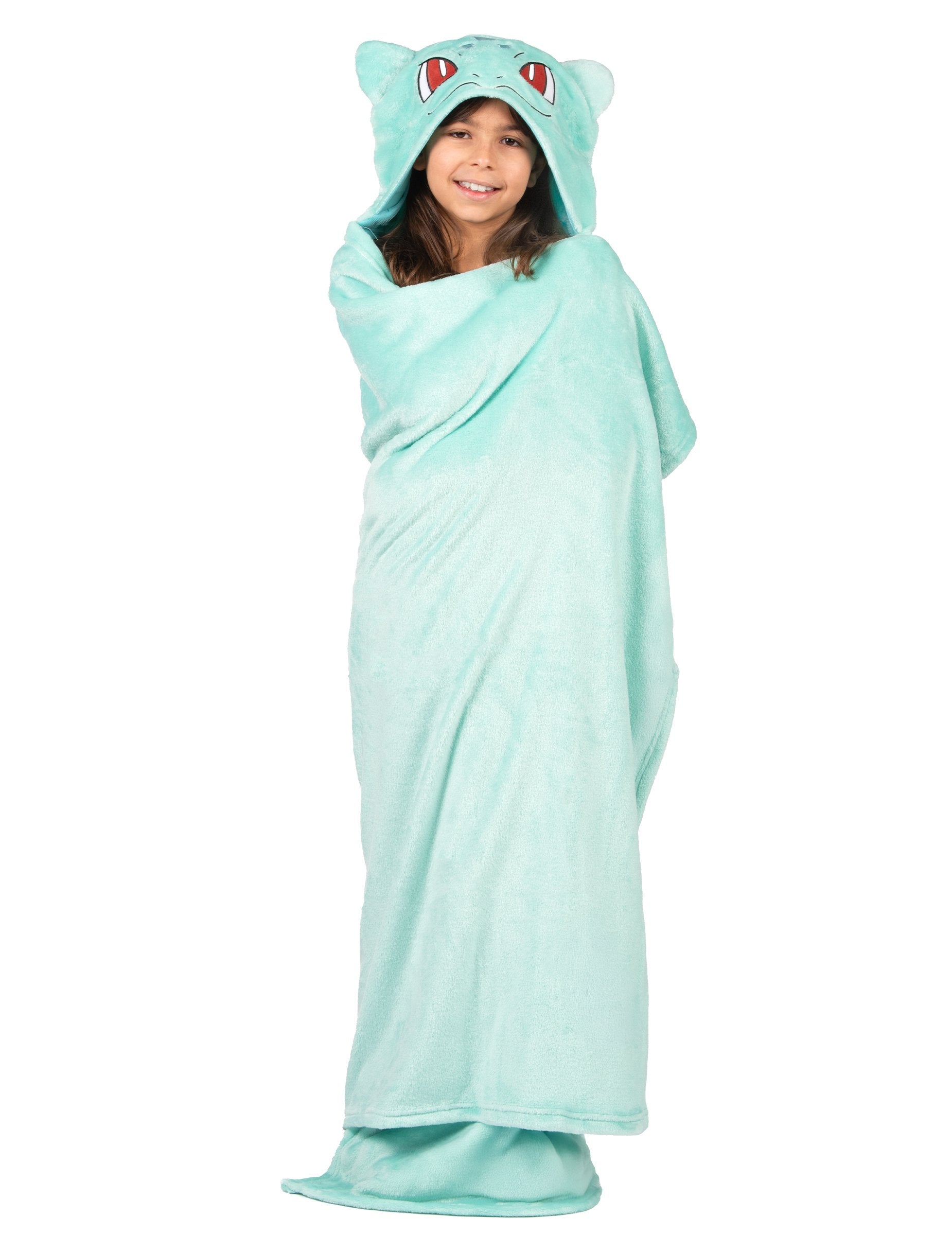 Tato kostýmová polarová deka s kapucí Bulbasaur Pokémon™ promění každý odpočinkový okamžik v dobrodružství plné něhy. Díky kapuci s obličejem Bulbasaur a roztomilými špičatými oušky zabalí děti do světa plného jemnosti.