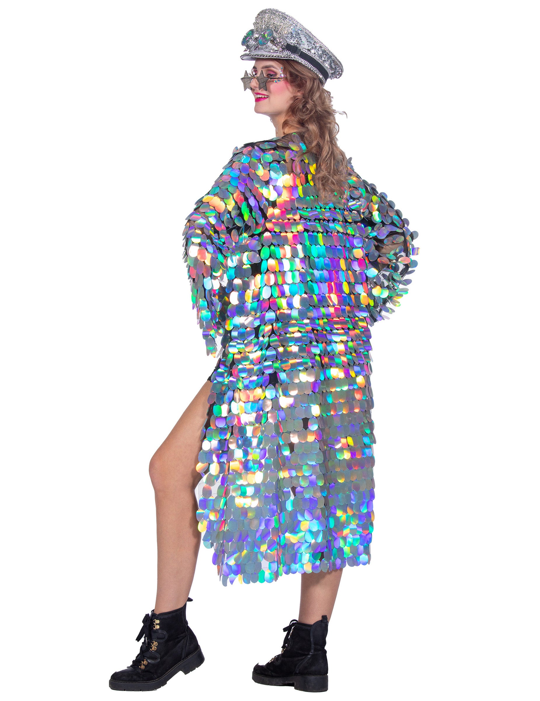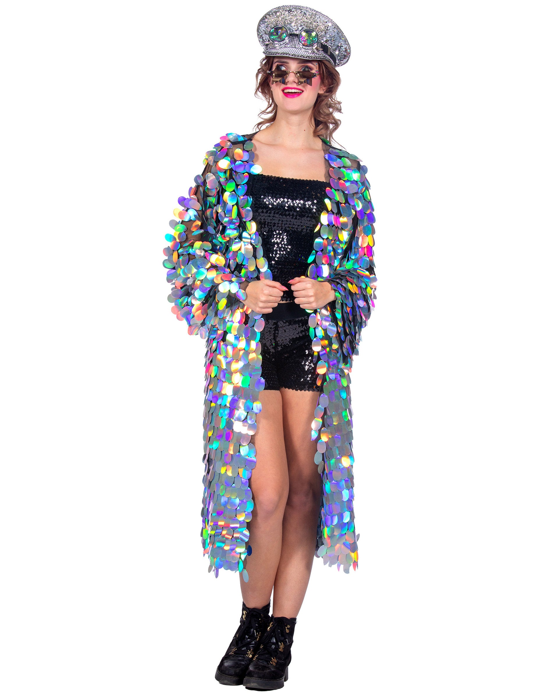 Navržena z lehké a pohodlné látky, je celá pokrytá velkými duhovými flitry, které odrážejí světlo při každém pohybu a vytvářejí oslnivý efekt. Její volný a splývavý střih umožňuje snadné nošení přes šaty nebo elegantní soupravu, přičemž zajišťuje eleganci i pohodlí. Precizní zpracování podtrhuje její prémiový vzhled a dodává jí jedinečný styl, který rozhodně nezůstane bez povšimnutí.