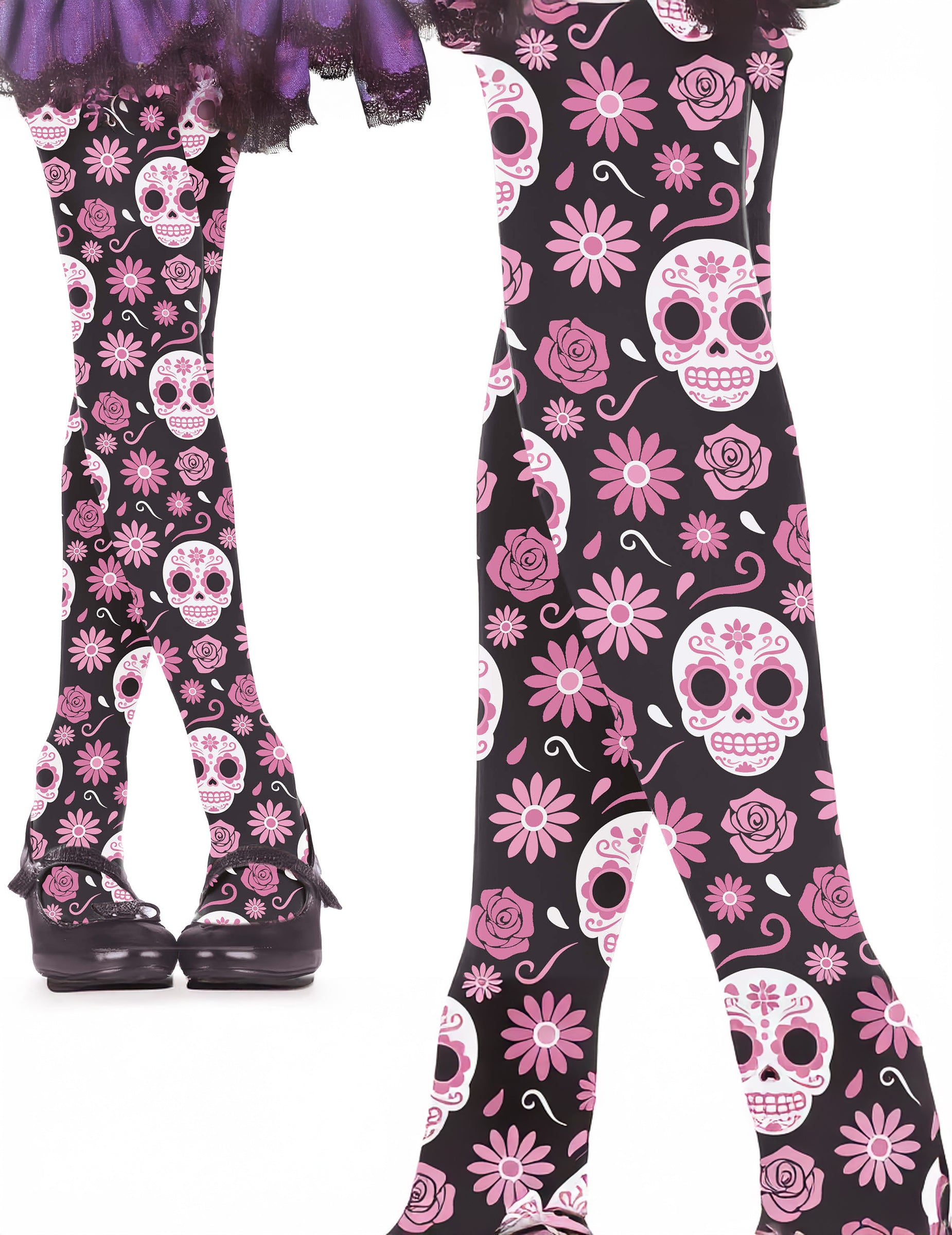 Dodá halloweenskému kostýmu vašeho dítěte jedinečný nádech s těmito punčocháčmi s motivem Catrina! Jsou inspirovány Dnem mrtvých a zdobí je květinové lebky a barevné vzory na černém pozadí, což je ideální pro doplnění mexického kostlivce nebo kostýmu Catrina. Tyto pohodlné a pružné dětské punčocháče jsou ideální na halloweenskou párty, karneval nebo představení.