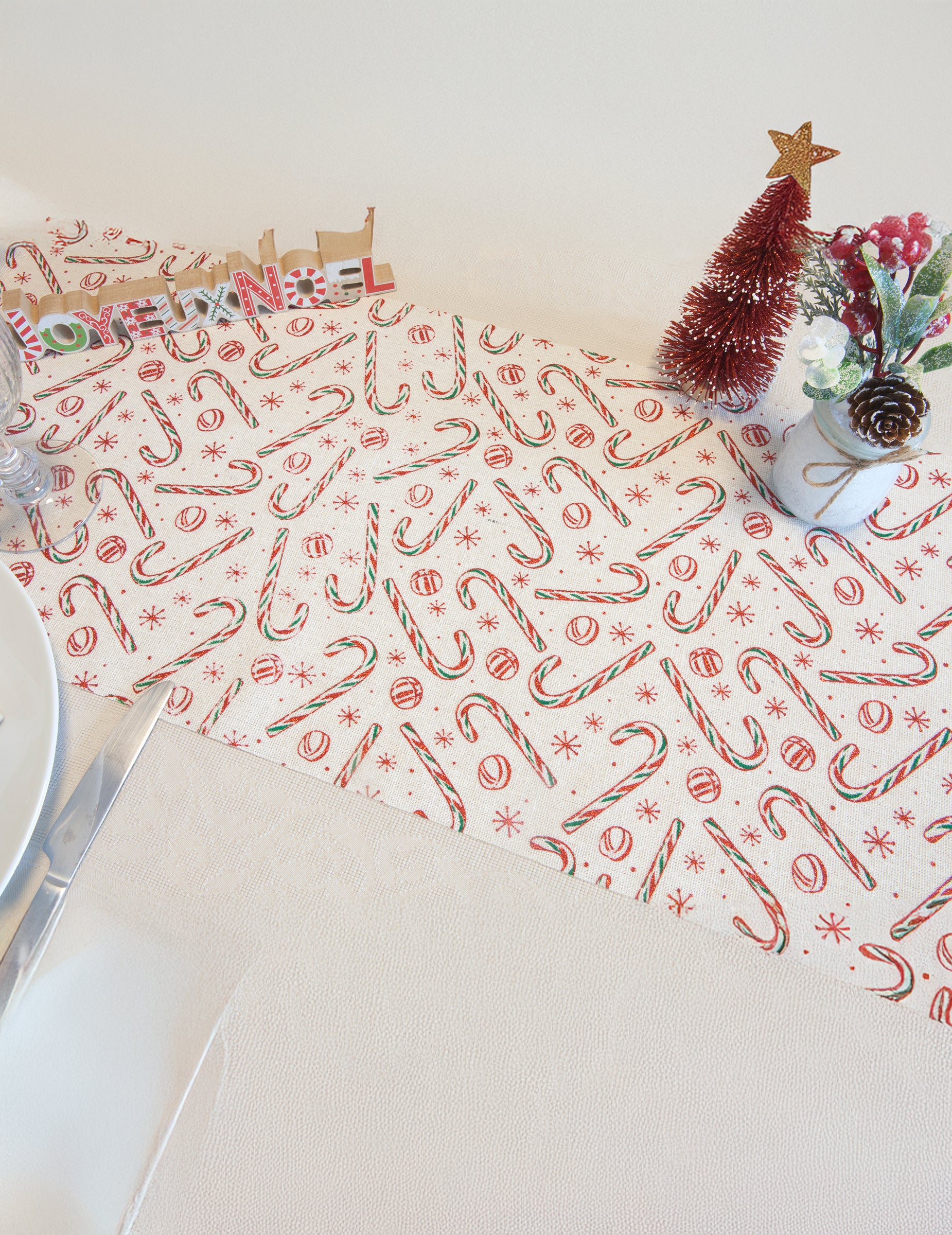 Vneste do své dekorace dotek shovívavosti Vánoční běhoun na stůl o délce 3 metry. Ilustrované krásnými vzory ječný cukr, tento plátěný doplněk okamžitě evokuje zimní říši divů a sladkosti na konec roku. Ideální pro zvýraznění vašeho ubrusu, skvěle ladí se zlatými, červenými nebo bílými tóny pro elegantní a přátelské přijetí.