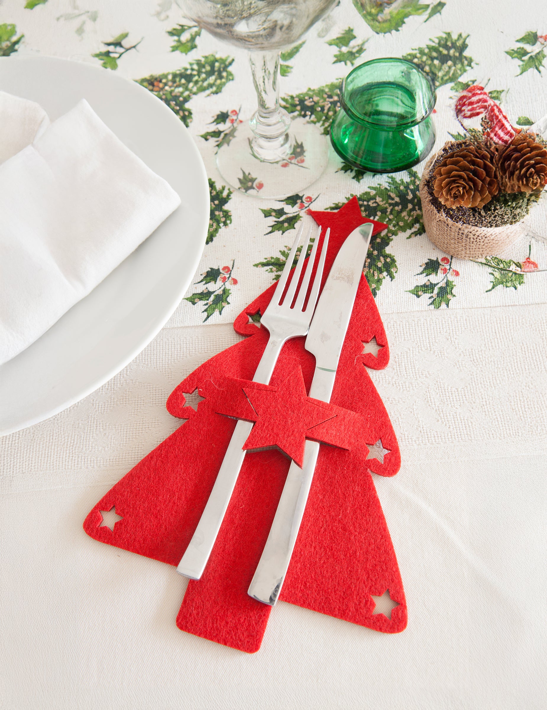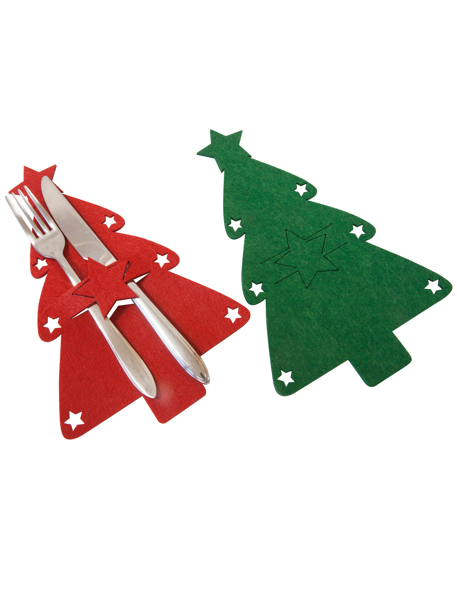 Vneste na svůj stůl sváteční atmosféru s touto sadou 4 kusů držák na příbory vyrobeno z plsti ve tvaru vánoční stromeček. K dispozici v červené nebo zelené barvě (náhodné dodání v závislosti na skladových zásobách), tyto doplňky jsou pěkně zdobené malými prolamovanými hvězdičkami. Umožňují vám elegantně prezentovat vaše nádobí a zároveň doplňovat vaše Vánoční dekorace. Tyto dekorativní prvky, ideální pro vaši silvestrovskou večeři, okamžitě promění vaše talíře a vytvoří přátelskou a vřelou atmosféru během oslav konce roku.