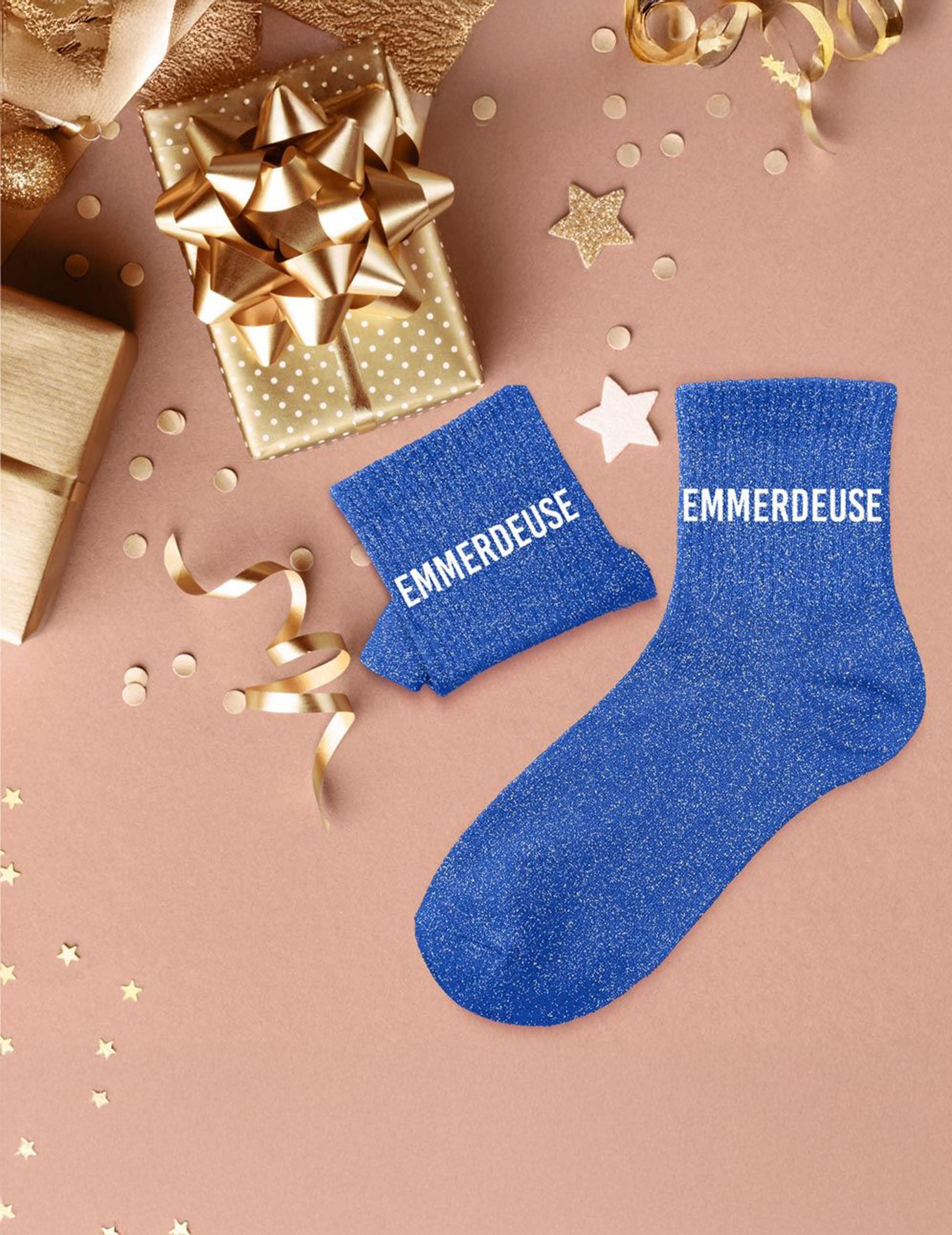 Nechte svou osobnost zazářit s těmito modrými třpytivými ponožkami pro ženy ve velikostech 36-42! Zdobené bílým nápisem "EMMERDEUSE" (Otravná) v sobě spojují odvahu, humor a styl. Jejich měkký a pružný materiál nabízí pohodlné nošení, zatímco třpytivé třpytky dodávají vašemu outfitu nádech světla. Zábavný a originální doplněk, ideální jako dárek plný osobnosti nebo k vyjádření vašeho temperamentu s brilancí a humorem.