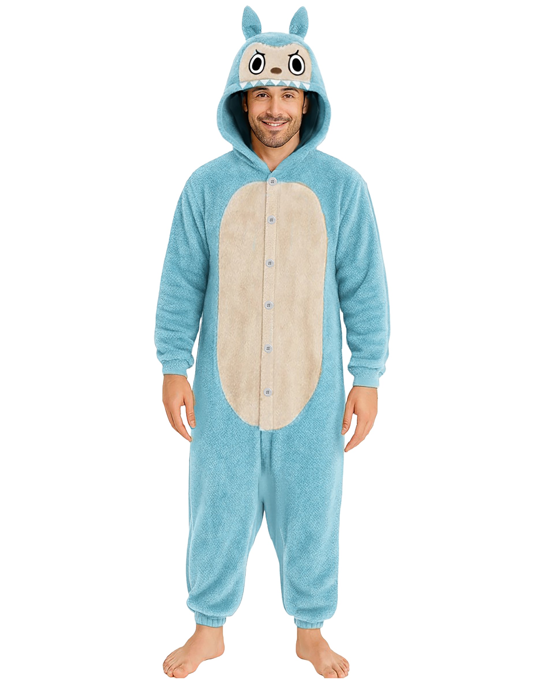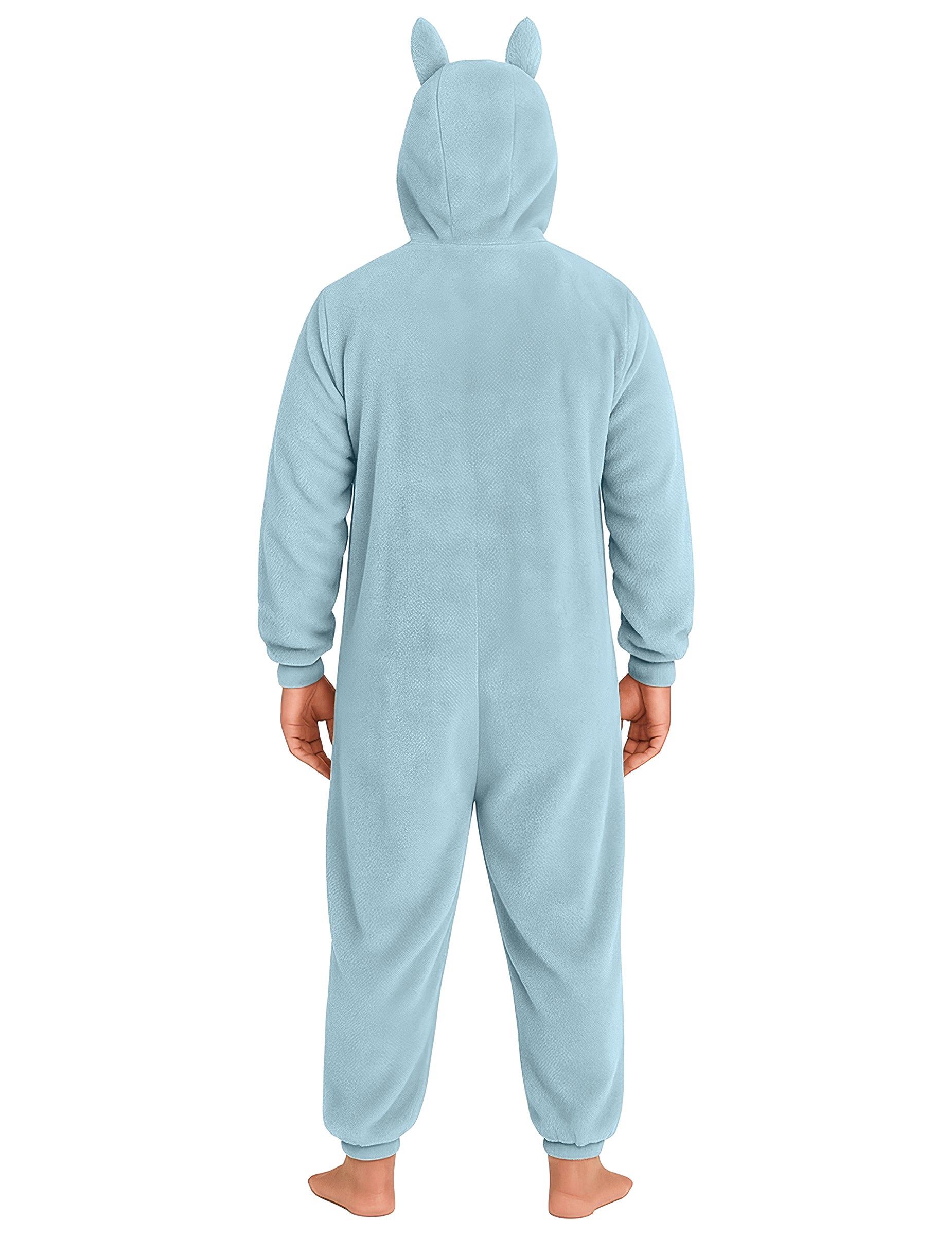 Modrá, měkká kombinéza obepíná tělo pro maximální pohodlí, ideální na maškarní párty nebo pro chvíle odpočinku. Kapuce s velkými ušima a šibalským obličejem dodává zábavný a originální vzhled. Díky knoflíkům vpředu se snadno obléká a je příjemná na nošení.