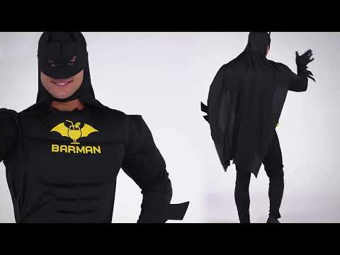 Tento Barman kostým pro dospělé promění maskovaného hrdinu v krále večírku. Černá kombinéza s efektem svalů je ozdobena žlutým logem Barman, což je vtipný odkaz na jeho humornou verzi. Jeho splývavý plášť, pásek s držáky na kelímky a ladící maska dotvářejí tento originální a slavnostní vzhled.