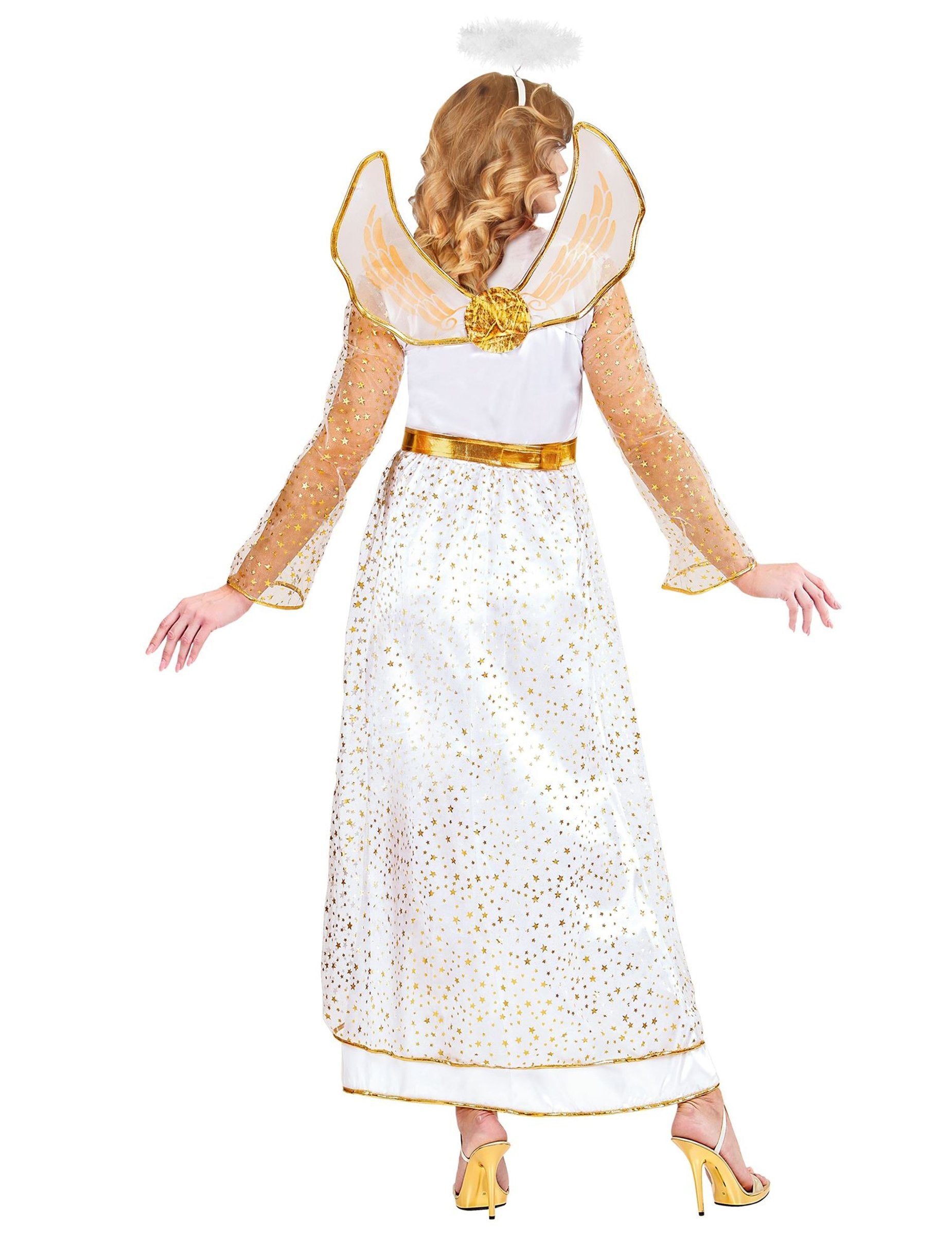 Tento bílo-zlatý andělský kostým pro ženy dodá vašim oslavám nebeský nádech. Dlouhé bílé šaty jsou doplněny třpytivými zlatými závoji a zlatým páskem, které vytvářejí zářivý a elegantní efekt. Třpytivé průsvitné rukávy dodávají kompletu éterickou jemnost. Zlatá křídla a bílá svatozář doplňují tento božský kostým, ideální pro ztvárnění dobrotivého anděla na představení, vánočním večírku nebo kostýmní akci.