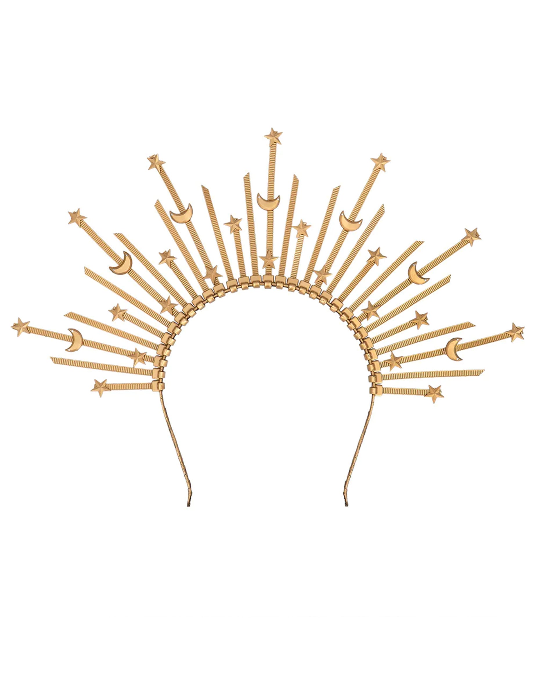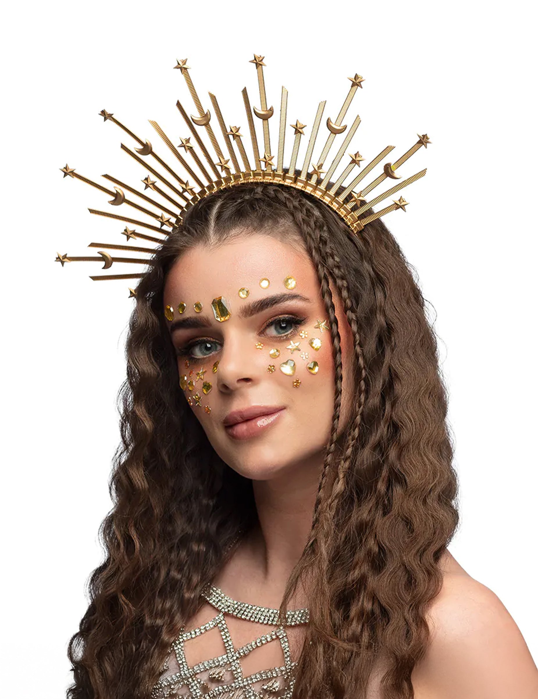 Tato čelenka pro dospělé s hvězdami a měsícem dodá vašemu outfitu mystický a elegantní nádech. Ve zlaté barvě se skládá z řady paprsků ozdobených hvězdami a půlměsíci, které kolem hlavy tvoří rafinovanou svatozář. Je lehká a pohodlná, snadno se nosí na festivalu, kostýmní párty nebo pohádkové akci a dokonale doplní kostým anděla, bohyně nebo nebeského tělesa.