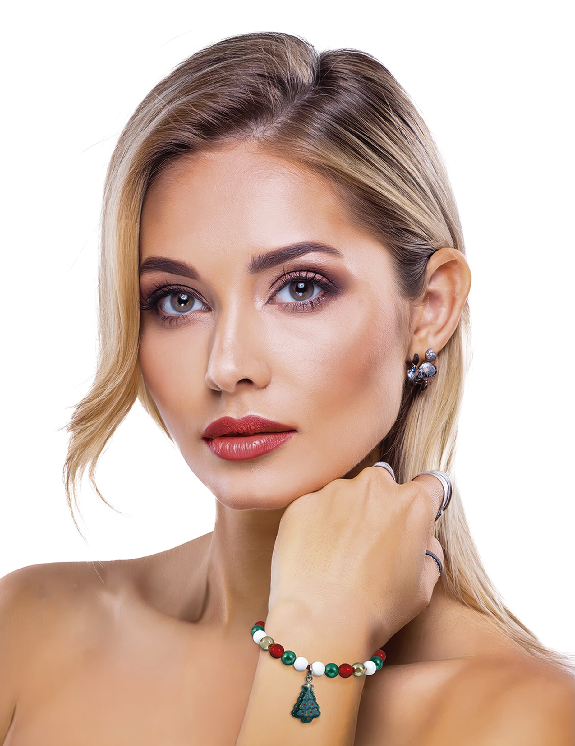 Tento náramek s vánočním motivem je perfektním doplňkem k vašemu svátečnímu outfitu. Je vyroben z červených, zelených, bílých a zlatých korálků a je doplněn malým ozdobeným přívěskem ve tvaru stromečku, který mu dodává veselý a barevný nádech. Díky nastavitelné červené šňůrce snadno padne na všechny velikosti zápěstí. Je ideální pro veselý a zábavný doplněk vašich vánočních oslav, ať už doma, v kanceláři nebo při slavnostní večeři.
