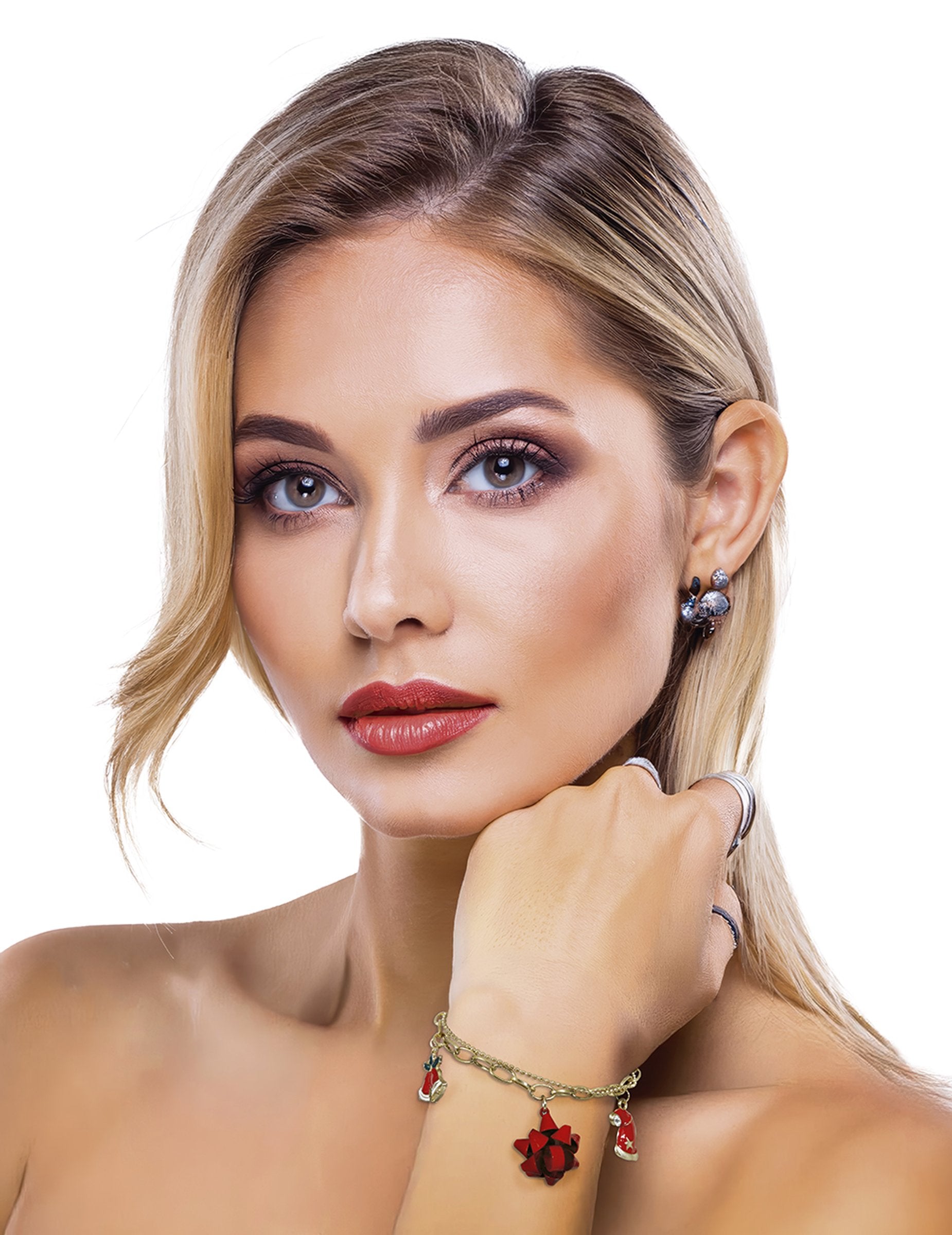 Tento kovový náramek s vánoční tematikou je opatřen červenými a zlatými přívěsky, které evokují kouzlo svátků: čepicí Santu, zdobeným zvonkem a třpytivou mašlí. Tyto sváteční prvky, upevněné na dvojitém zlatém řetízku, dodávají vašemu zápěstí jiskru a eleganci. Díky nastavitelné sponě padne všem velikostem a lze jej nosit se slavnostním outfitem nebo jako každodenní nošení během vánočního období. Rafinovaný doplněk pro stylovou oslavu svátků.