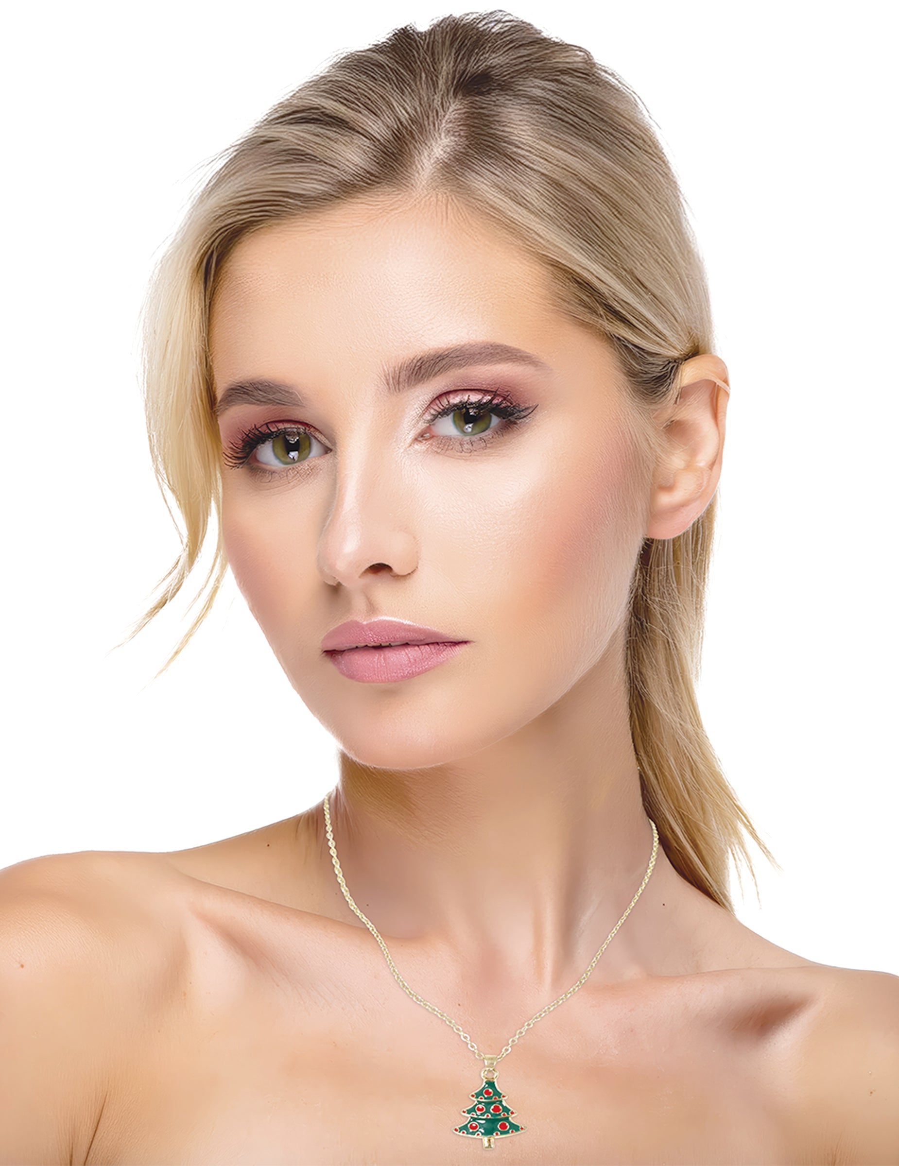 Tento vánoční přívěsek ve tvaru stromečku dodá vašim svátečním outfitům elegantní a veselý nádech. Jeho zelený přívěsek ve tvaru stromečku, zdobený malými červenými ozdobami a zlatými detaily, evokuje veškeré kouzlo Vánoc. Jemný, nastavitelný řetízek usnadňuje jeho přizpůsobení vašemu stylu, ať už ho nosíte s elegantními šaty nebo sezónním svetrem. Jemný a sváteční šperk, ideální pro zářivý zážitek během vánočních oslav.