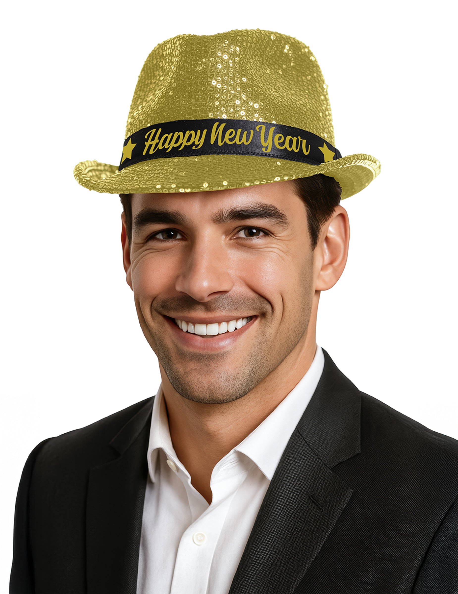 Tato zlatá flitrovaná čepice je perfektním doplňkem pro stylovou oslavu Nového roku. Ozdobená černou stuhou s nápisem „Šťastný nový rok“ obklopeným zlatými hvězdami jistě upoutá pozornost a okamžitě dodá vašemu outfitu slavnostní nádech. Lehká a třpytivá čepice se dokonale hodí k elegantnímu outfitu a oslaví Silvestra v oslnivé atmosféře.