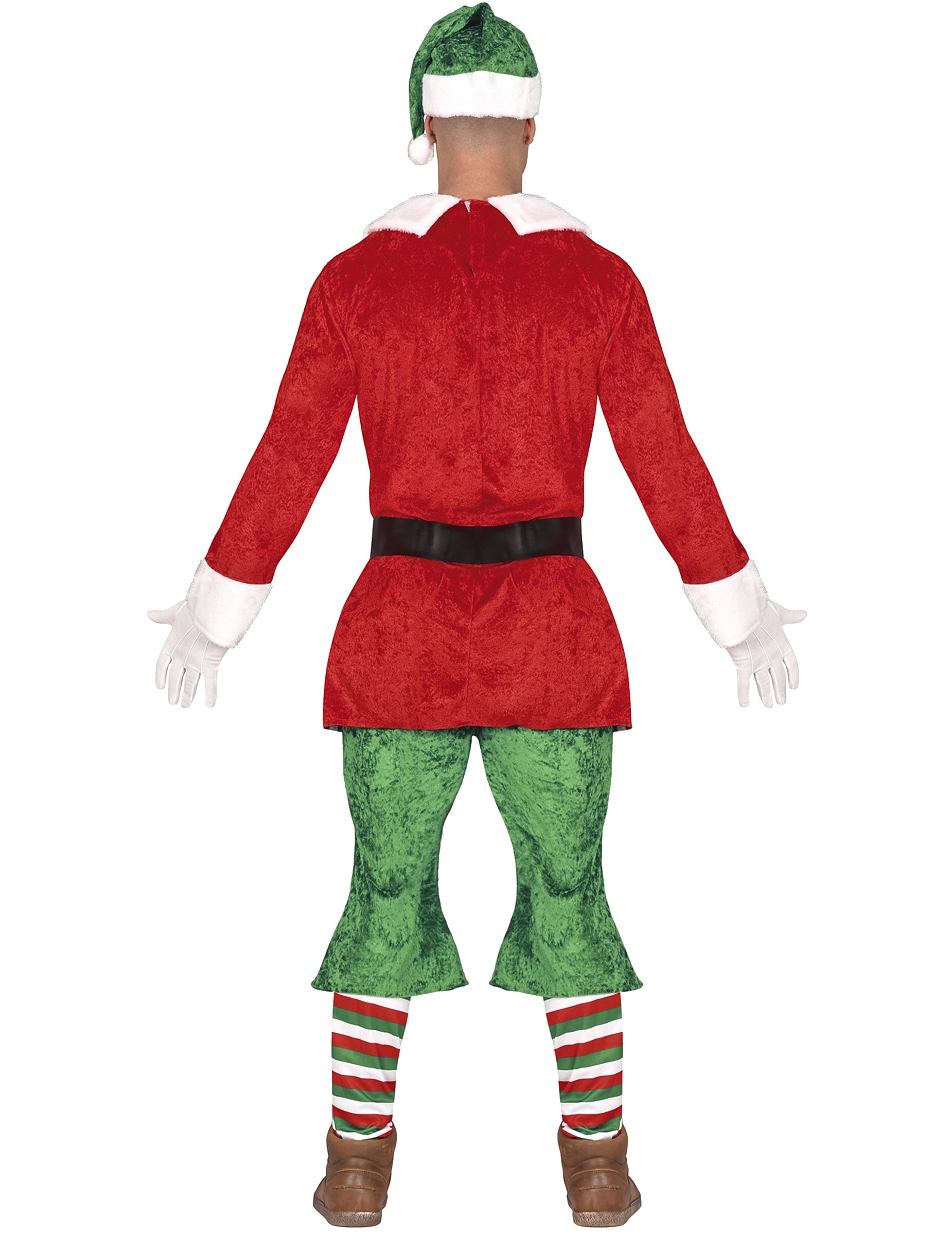 Tento pánský vánoční elfský kostým se skládá z červené tuniky s bílým límcem zdobeným zlatými knoflíky a černého pásku se zlatou přezkou. Texturované zelené kalhoty, červenobíle pruhované návleky na nohy a klobouk ve stejném stylu dokonale doplňují tento veselý a tradiční outfit. Ideální kostým pro oživení svátečního období humorem a dobrou náladou.